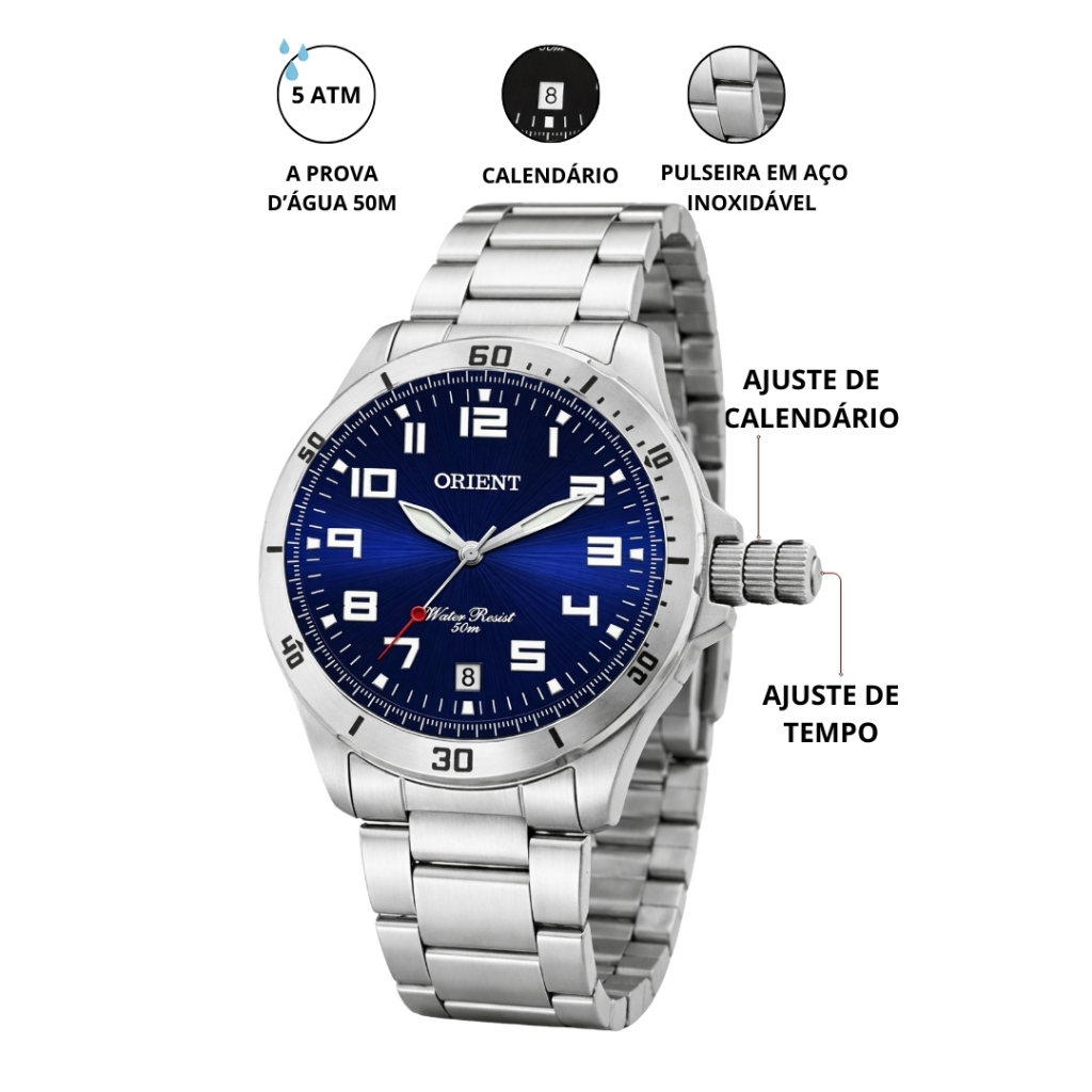 Relógio Orient Analógico Masculino Clássico Prateado Quartz Em Aço Inox Calendário Prova D'água 5 ATM Original