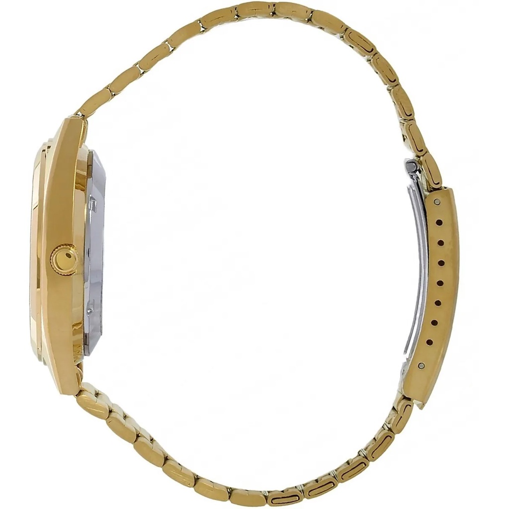 Funções - Analógico - Calendário dia do mês e da semana (portugues/ingles) Características - Mecânico / Automático - Coroa: Simples - Tampa posterior : Rosqueada - Resistência à água : 30m - Vidro : Cristal Mineral - Mostrador : Preto com detalhes dourado - Ponteiros luminosos (Fluorescente) - Material da caixa : Aço Dourado - Material da pulseira : Aço Dourado Medidas - Diâmetro da caixa : 3,7 cm - Diâmetro do visor : 3 cm - Espessura da caixa : 1,1 cm