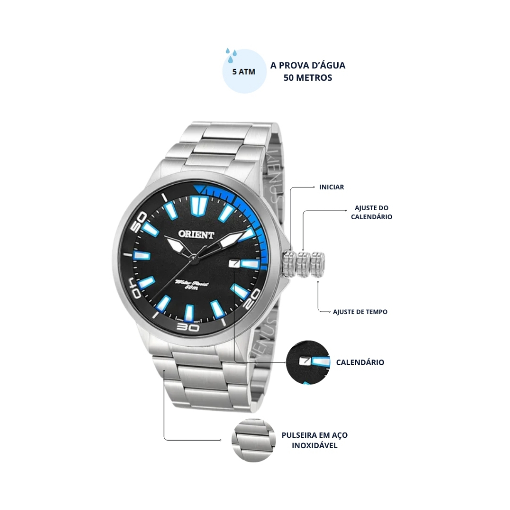 Confeccionado com precisão e esmero, cada relógio é todo em aço inoxidável, que exibe um design redondo e um visor de cristal mineral, unindo uma estética impecável à durabilidade e à alta precisão. Além disso, a resistência à água garante uma tranquilidade extra em qualquer situação. Atenção: Para que seu relógio tenha a garantia de 12 meses (1 ano) reconhecida pela fabricante Orient, é necessário realizar a ativação da garantia. Para isso, basta escanear o QR Code localizado na etiqueta do produto e seguir as instruções. Especificações do Relógio: Marca: Orient; Modelo do Relógio: MBSS1196A-PASX; Gênero: Masculino Mecanismo: Quartz; Cor da Caixa: Prateado; Cor do Bisel: Prateado; Cor da Pulseira: Prateado; Cor do Mostrador: Preto com detalhes azuis; Material da Caixa: Aço Inoxidável; Material da Pulseira: Aço Inoxidável; Material do Vidro do Mostrador: Cristal Mineral; Tipo de Fecho do modelo: Dobrável com trava lateral; Medidas do Modelo: Espessura da Caixa: 9.3mm; Diâmetro da Caixa: 44.6mm; Diâmetro do Visor: 36.1mm; Largura da Pulseira: 19.7mm; Largura da Base da Pulseira: 21.5mm; Circunferência da Pulseira: 21cm; Circunferência da Pulseira com a Caixa: 25,5cm; Peso sem Embalagem: 111g; Fundo do Relógio: Rosqueado. Recursos do Modelo: Possui Calendário com dia do mês (1-31); Possui Efeito Fosforescentes presentes em seus ponteiros e Marcadores. Conteúdo da Embalagem: 1 Relógio Orient Original; 1 Certificado de Garantia de Fábrica (1 ano); 1 Caixa Original Orient. Resistência à Água - 5 ATM: Adequados para natação se não existir grandes alterações de temperatura. Não aptos para mergulho nem mergulho com ar comprimido. Atenção e Cuidados: Não usar o relógio durante o banho, pois os produtos que são utilizados durante o banho podem comprometer a vedação e a qualidade do seu relógio. Certifique-se de que a coroa está totalmente encaixada antes do contato com a água. Nunca pressione botões ou ajuste a coroa enquanto o relógio estiver molhado ou submerso. Após exposição à água salgada, enxágue o relógio em água doce e seque-o completamente. Não exponha o relógio à água quente ou morna, pois isso pode afetar a vedação e reduzir sua resistência à água. Perguntas Frequentes: Somos a Loja Oficial da Relojoaria Wenus; Tamanho: Médio; Produto: Original; Acompanha Nota Fiscal; Pronta Entrega Disponível; Não Possui Catraca Giratória; Para uma visualização imediata do efeito fosforescente, posicione uma luz diretamente sobre o mostrador por cerca de 10 segundos. Depois, leve o relógio para um ambiente escuro e veja os ponteiros e marcadores brilharem. Nossos Clientes contam com uma equipe de especialistas altamente qualificados para atender todas as suas necessidades. Frete grátis podendo ter alteração de acordo com a região. O relógio Orient une funcionalidade, estilo e confiabilidade em um design robusto e elegante. Ideal para acompanhar todos os momentos do seu dia a dia, ele é a escolha perfeita para quem valoriza qualidade e praticidade. Escolha Orient, escolha excelência!