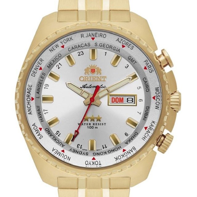 Relógio ORIENT Mod. 469GP057F S1KX Genero: Masculino Tamanho: Grande Funções - Analógico - Calendário dia do mês e da semana - Hora Mundi Características - Mecânico / Automático - Coroa: Simples - Botoes: Simples - Tampa posterior : Rosqueada - Resistência à água : 100m - Pode nadar: Sim - Pode lavar mãos: Sim - Pode tomar Chuva: Sim - Pode tomar Banho: Não - Vidro : Cristal Mineral - Mostrador : Prata com cifras dourado - Ponteiros luminosos (Fluorescente) - Material da caixa : Aço Dourado - Material da pulseira : Aço Dourado Medidas - Diâmetro da caixa : 4,7 cm - Diâmetro do visor : 3,9 cm - Espessura da caixa : 1,2 cm