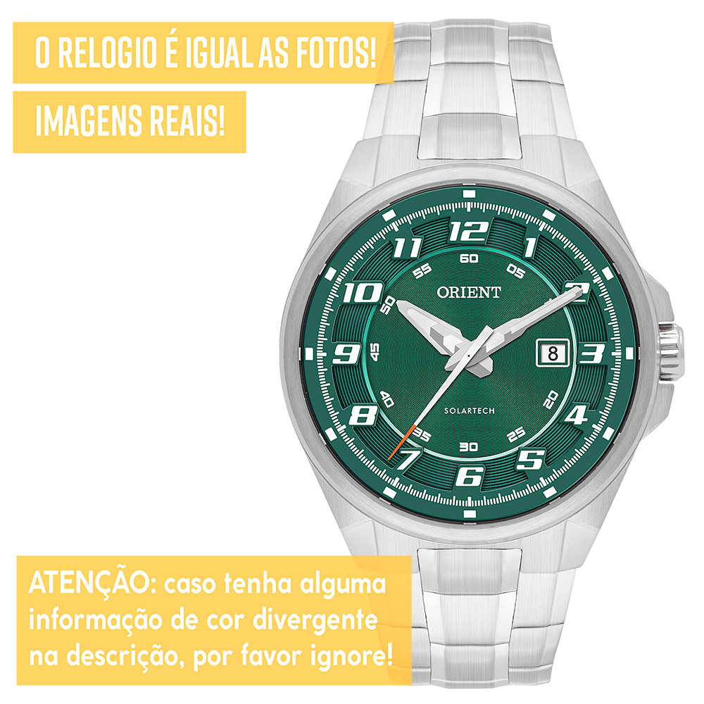 Bem vindo! Procurando por uma joia cheia de estilo, tecnologia e que dure a vida inteira? Encontrou! Dê o incrível relógio Orient de presente para você mesmo ou para alguém querido. *1 ANO DE GARANTIA ORIENT - Produto com NOTA FISCAL* Atuamos somente com produtos 100% ORIGINAIS! Leve em um especialista de sua região para comprovar. Você sabe o que é um ORIENT SOLARTECH? O sistema SOLARTECH, é uma tecnologia Ortient na qual o relógio é alimentado por luz solar ou artificial. O relógio dispensa trocas de bateria, pois a tecnologia SOLARTECH carrega o relógio automaticamente. Os modelos SOLARTECH possuem um mecanismo interno que captura a luz natural ou artificial e transforma em energia. Ficha Técnica PROVA D'ÁGUA: Sim - selo de resistência 5 ATM (resistência até 50 metros de profundidade) MATERIAL DO VIDRO: Cristal mineral resistente a riscos MAQUINÁRIO: Tecnologia SOLARTECH - O relógio Orient Solartech funciona sem bateria pois seu mecanismo transforma luz natural e artificial em energia. MATERIAL DO RELÓGIO: Aço inoxidável. Medidas TAMANHO DA CAIXA (mostrador): 4,5 cm (45 mm) - tamanho médio ESPESSURA DA CAIXA (mostrador): 1,1 cm (11 mm) LARGURA DA PULSEIRA: 1,9 cm (19 mm) CIRCUNFERÊNCIA DA PULSEIRA: 26 cm (pode ser diminuída para servir em todo tipo de pulso) Funções Solartech Ponteiros Fosforescentes Calendário Acompanha Relógio Orient, caixa original Orient, manual de instruções em português, certificado de garantia e nota fiscal. Nossos produtos são todos tratados com máximo cuidado, profissionalismo e atenção. Enviamos o seu relógio em uma embalagem reforçada, protegida por dentro e por fora. Caso não tenha gostado ou simplesmente se arrependeu, devolva o produto sem preocupações. Você tem 30 dias a partir do recebimento para devolvê-lo. COMPRE COM SEGURANÇA Revendedor autorizado Orient
