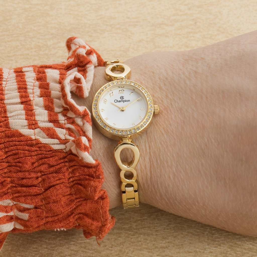 Características: - Gênero: Feminino - Marca: Champion - Composição do Vidro: Cristal Mineral - Pulseira: Aco inox - Cor da Caixa: Dourado - Marcações: Dourado - Aro: Pedras - Cor do fundo: Branco - Resistência à Água: 5 ATM - Tipo de Mecanismo: Quartzo - Tampa Fundo: Rosqueado - Fecho: Gancho Medidas: - Diâmetro da caixa: 24 mm (Pequeno) O Relógio acompanha: - Manual de Instruções - Caixa Champion - Nota fiscal - Certificado de Garantia (1 ano direto com o fabricante)