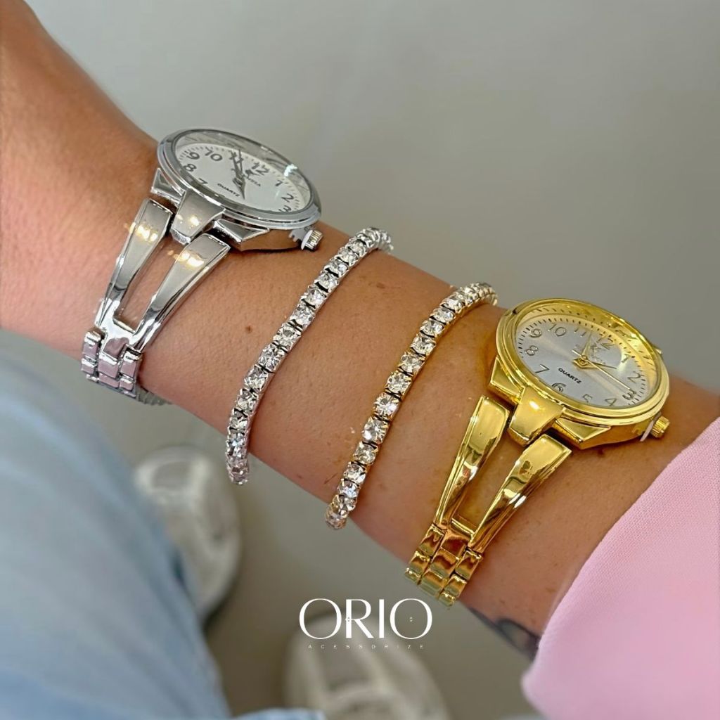 Sejam bem vindas! Loja Oficial. * Movimento: Quartzo de alta precisão. * Bateria: Modelo 377. * Visor: Vidro mineral, projetado para ser resistente a batidas do uso diário. * Material: Confeccionado em metal de alta qualidade com tratamento anticorrosivo, garantindo maior durabilidade e brilho. * Pulseira: Totalmente ajustável, adapta-se a diversos tamanhos de pulso. Possui fecho do tipo gancho e presilha para segurança e praticidade. 💧 Cuidados e Resistência à Água: * Resistente à Água (Uso Diário): Suporta respingos leves, como chuva ou lavar as mãos. * ATENÇÃO: Para garantir a maior vida útil do seu relógio, NÃO é recomendado para uso em mergulhos, natação ou contato prolongado com água quente, vapor, ou produtos químicos (álcool, perfumes, etc.).