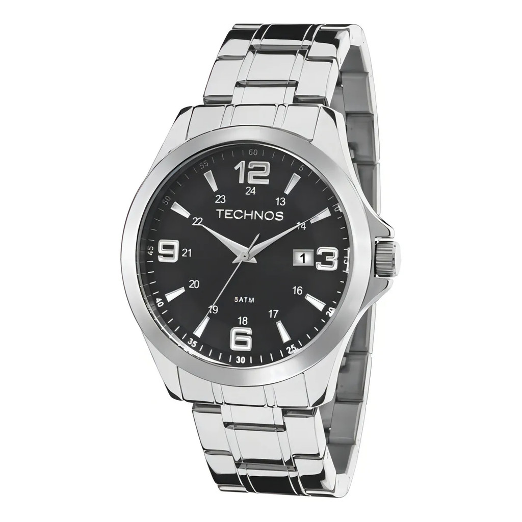 Relógio Pulso Masculino Technos 2115MKTS1P Racer Basico Prata Fundo Preto Analógico Pulseira Aço Prova D'água 50m