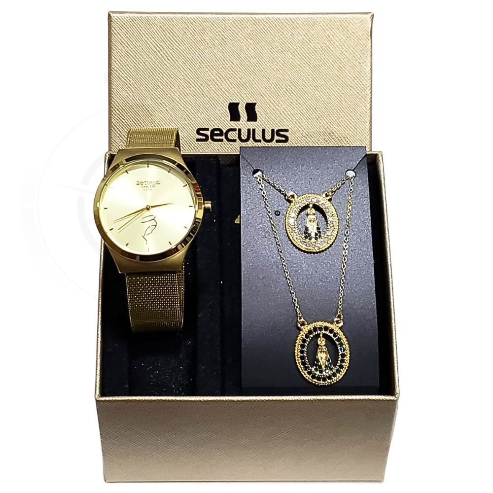 SOBRE A EMPRESA: Somos a Relógios Campana, uma empresa especializada em vendas online, revendedora autorizada das maiores marcas do mercado. Trabalhamos apenas com relógios originais com garantia de fábrica. Comprando conosco você tem a segurança que receberá seu produto nas seguintes condições: => REVENDEDOR AUTORIZADO => PRODUTO ORIGINAL => GARANTIA DO FABRICANTE => PRODUTO NOVO => EMBALAGEM ORIGINAL DO PRODUTO => MANUAL DE INSTRUÇÕES => CERTIFICADO DE GARANTIA => NOTA FISCAL => RELÓGIO A PRONTA-ENTREGA SOBRE O PRODUTO: Kit para presentear os cristãos devotos. Vem com um relógio analógico e um lindo colar. O relógio é um modelo analógico todo dourado com mostrador minimalista e gravação de Nossa Senhora. Já o colar é um modelo duplo que combina com a cor do relógio e possui pingentes de Nossa Senhora. Especificações: Marca: Seculus Modelo: 44040LPSKDA1K1 Tipo de relógio: Analógico Gênero: Feminino Cor da caixa: Dourado Cor da pulseira: Dourado Estilo: Casual Alarme: Não Cronômetro: Não Calendário: Não Luz: Não Resistência à água: Sim – 5 ATM = 50 metros Tipo de fecho: Fivela de gancho Material da caixa: Aço Material da pulseira: Aço Características do vidro: Cristal Mineral Tamanho da caixa: 38 mm Espessura da caixa: 9 mm Comprimento da pulseira: 23 cm Largura da pulseira: 18 mm Tampa do fundo: Rosqueado Peso: 61 Gramas Alimentação: Bateria Conteúdo da Embalagem: Relógio, nota fiscal, certificado garantia e manual de instruções Garantia do Fabricante: 12 meses Fabricante: Seculus da Amazônia Indústria e Com. S/A