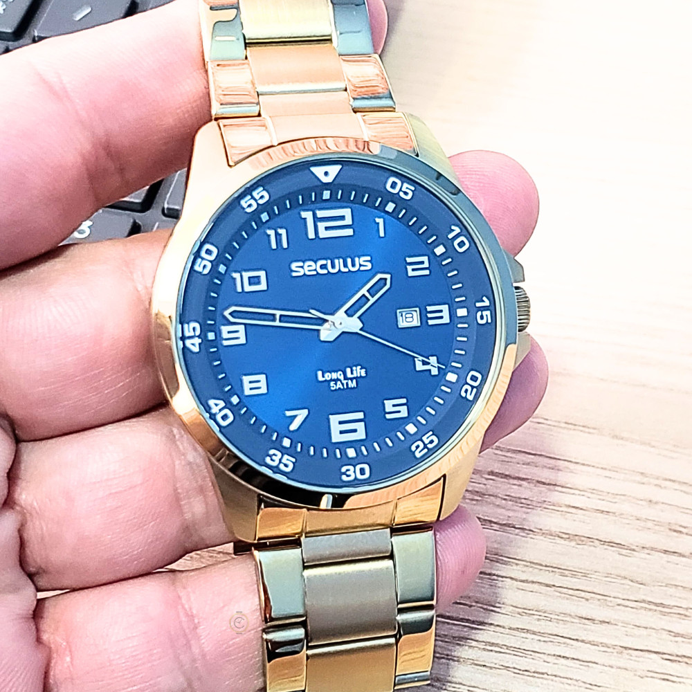SOBRE A EMPRESA: Somos a Relógios Campana, uma empresa especializada em vendas online, revendedora autorizada das maiores marcas do mercado. Trabalhamos apenas com relógios originais com garantia de fábrica. Comprando conosco você tem a segurança que receberá seu produto nas seguintes condições: => REVENDEDOR AUTORIZADO => PRODUTO ORIGINAL => GARANTIA DO FABRICANTE => PRODUTO NOVO => EMBALAGEM ORIGINAL DO PRODUTO => MANUAL DE INSTRUÇÕES => CERTIFICADO DE GARANTIA => NOTA FISCAL => RELÓGIO A PRONTA-ENTREGA SOBRE O PRODUTO: Todo em aço este relógio tem catraca lisa, visor azul, função calendário, ponteiros e marcadores dourados. A pulseira trabalhada com elos em aço escovado e polido possui fecho dobrável por trava de pressão. A composição de cores o torna um acessório notável, perfeito para o dia a dia. Especificações: Marca: Seculus Modelo: 20802GPSVDA2 Tipo de relógio: Analógico Gênero: Masculino Cor da caixa: Dourado Cor da pulseira: Dourado Estilo: Casual Alarme: Não Cronômetro: Não Calendário: Sim Luz: Não Resistência à água: Sim – 5 ATM = 50 metros Tipo de fecho: Dobrável, com trava de segurança Material da caixa: Aço Material da pulseira: Aço Características do vidro: Vidro mineral Tamanho da caixa: 46 mm Espessura da caixa: 11 mm Comprimento da pulseira: 25 cm Largura da pulseira: 23,8 mm na junção com a caixa Tampa do fundo: Rosqueado Peso: 91 Gramas Alimentação: Bateria Conteúdo da Embalagem: Relógio, nota fiscal, certificado garantia e manual de instruções Garantia do Fabricante: 24 meses Fabricante: Seculus da Amazônia Ind e Com S/A Ficou alguma dúvida? Estamos à disposição pelo campo de mensagens!