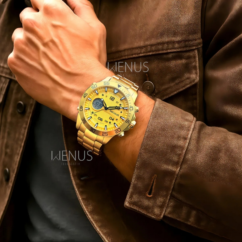 Relógio masculino com estilo moderno e esportivo, ideal para qualquer ocasião. Fabricado em aço inoxidável, possui visor redondo de cristal mineral, ponteiros analógicos e acabamento de alta qualidade. A pulseira também em aço inoxidável oferece resistência e durabilidade para diversas ocasiões. A prova D'água, combina praticidade e sofisticação. A marca Seculus é reconhecida mundialmente por seus modelos originais, com design exclusivo, precisão e excelência. Informações do Relogio: Gênero: Masculino. Recursos do Modelo: Possui Efeito Fosforescentes presente em seus ponteiros e marcadores. Possui Luz Noturna na tonalidade Verde. Possui Calendário com dias da Semana (Mon-Sun), dia do mês (1–31) e mês do ano (1–12). Possui Cronômetro. Possui Alarme (Sonoro). Possui Formato 12/24hrs. Características do Modelo: Cor da Caixa: Dourado; Cor da Pulseira: Dourado; Material da Caixa: Aço Inoxidável; Material da Pulseira: Aço Inoxidável; Material do Vidro: Cristal Mineral; Tipo de Fecho: Dobrável com Trava. Medidas do Modelo: Espessura Caixa:16mm; Diâmetro Caixa:52.5mm; Diâmetro Visor:38mm; Largura Pulseira:22.5mm; Largura Pulseira Base:24mm; Circunferência da Pulseira:20.5cm; Circunferência Pulseira com a caixa:26.5cm; Peso sem a embalagem:194g; Peso da caixa com relógio:401g; Fundo do relógio: Rosqueado. Prova D'água 100 metros - 10 ATM: Adequado para a maioria dos desportos aquáticos como a vela, o mergulho e a natação em águas pouco profundas. Não adequado para mergulho com ar comprimido. Atenção e Cuidados: Não usar o relógio durante o banho, pois os produtos que são utilizados durante o banho podem comprometer a vedação e a qualidade do seu relógio. Certifique-se de que a coroa está totalmente encaixada antes do contato com a água. Nunca pressione botões ou ajuste a coroa enquanto o relógio estiver molhado ou submerso. Após exposição à água salgada, enxágue o relógio em água doce e seque-o completamente. Não exponha o relógio à água quente ou morna, pois isso pode afetar a vedação e reduzir sua resistência à água.