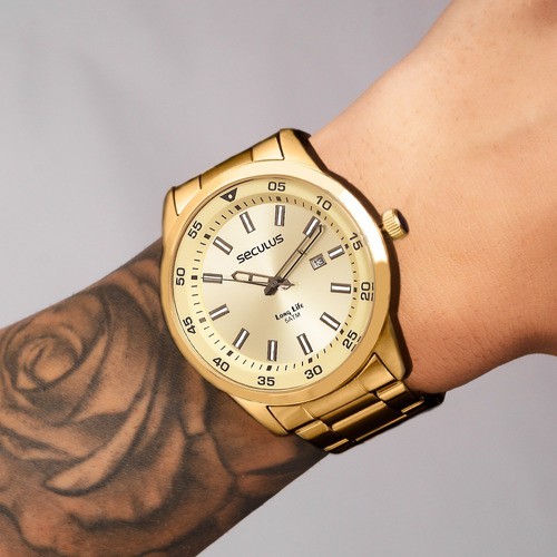 Compre o Relógio Seculus Masculino Long Life 20786GPSVDA2 na Eclock, a maior loja de relógios do Brasil. Vamos conhecer um pouco mais sobre o produto? Possui mecanismo Analógico, a pulseira é na cor Dourado, fabricada em Aço, com 26 cm de comprimento e possui Fecho Dobrável com Trava. A Caixa (peça onde fica o mostrador) é fabricada em Aço, mede 4,6 cm de diâmetro, sem considerar a coroa, e 1,1 cm de espessura, o que é considerado tamanho Grande para relógios do gênero Masculino. O Relógio Seculus Masculino Long Life 20786GPSVDA2 tem nível de resistência à água especificado em 5 ATM. Com relação as funções adicionais do relógio: possui Calendário Analógico com Data e Marcadores com Illuminator. É Fabricado por Seculus da Amazônia Indústria e Comércio SA. CNPJ: 34.516.088/0001-10 e tem Garantia de 2 Anos com o Fornecedor.