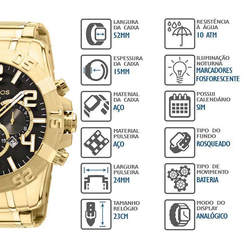 PRODUTO ORIGINAL GARANTIDO!!! Somos revendedores autorizados da marca Technos. *** Temos Disponivel, ENVIO IMEDIATO ! *** Relogio Technos OS20IM/4P Informacoes Basicas - Marca: Technos - Referencia: OS20IM/4P - Genero: Masculino - Garantia: 1 Ano diretamente com o fabricante Funcoes: - Analogico - Calendario - Cronografo Caracteristicas - Composicao do Vidro: Cristal mineral - Material da Caixa: Aco - Cor da Caixa: Dourado - Material da pulseira: Aco - Cor da Pulseira: Dourado - Bateria Descricao: Relogio Technos masculino com caixa e pulseira de aco. O reconhecido modelo Big Case possui caixa robusta e ganha forca com o banho dourado e mostrador preto, ideal para homens com personalidade e que desejam se destacar Medidas -Diametro da Caixa: 5,2 cm Resistencia a Agua 10 ATM - WR: 100 Mts - Pode Lavar as Maos: SIM - Pode Usar em Agua Corrente: SIM - Pode Usar na Piscina: SIM - Pode Usar em Mergulho Profundo: NAO Acompanha: - Manual de instrucoes - Embalagem - Certificado de Garantia - Nota Fiscal Ainda esta com duvida? Entre em contato conosco atraves do canal de perguntas, atendimento diario, respostas rapidas e estaremos sempre a disposicao para lhe atender.
