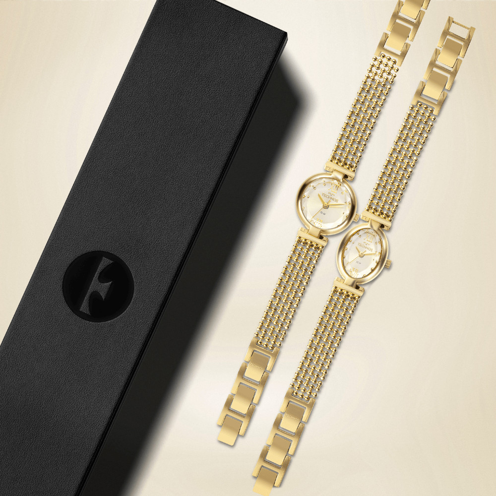 Sua nova caixa, pequena e delicada, possui uma construção diferenciada. Com a caixa em formato oval, ele oferece o requinte da pulseira sólida, estruturada com fecho de joia, e a classe do vidro facetado, que reflete ainda mais a luz. Seu mostrador conta com a presença da elegante numeração romana nas posições de 6/12 horas e detalhes metalizados nos demais marcadores de hora. Produto 100% em aço inoxidável, com máquina quartz Japonesa Miyota e resistência à água de 50 metros.