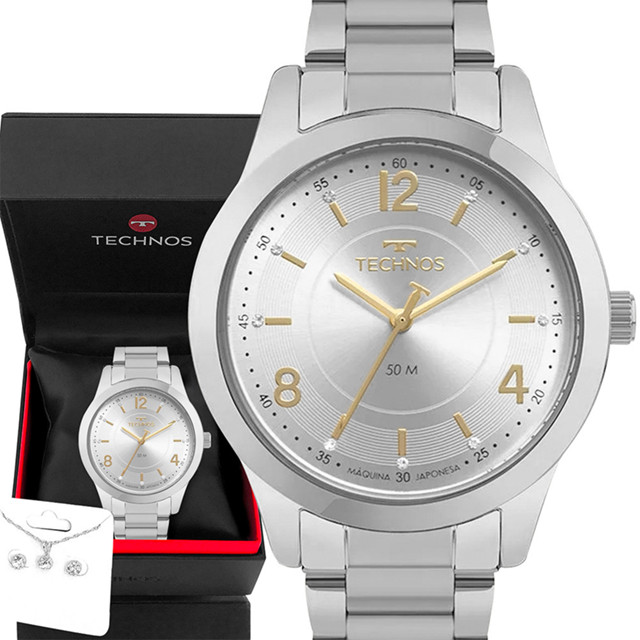 Bem vindo! Procurando um presente perfeito? Encontrou! Dê um lindo kit Technos de presente para você mesmo, ou para alguém querido! *1 ANO DE GARANTIA TECHNOS - Produto com NOTA FISCAL* *ACOMPANHA SEMI JOIAS COLAR E BRINCOS* Atuamos somente com produtos 100% ORIGINAIS! Leve em um especialista de sua região para comprovar. Ficha Técnica PROVA D'ÁGUA: Sim - selo de resistência 5 ATM (resistência até 50 metros de profundidade) MATERIAL DO VIDRO: Cristal mineral resistente a riscos MAQUINÁRIO: Analógico - quartzo - bateria MATERIAL DO RELÓGIO: Aço inoxidável COR DO FUNDO: Prata Medidas TAMANHO DA CAIXA (mostrador): 3,8 cm (38 mm) ESPESSURA DA CAIXA (mostrador): 0,9 cm (9 mm) LARGURA DA PULSEIRA: 1,5 cm (15 mm) CIRCUNFERÊNCIA DA PULSEIRA: 25 cm Acompanha Relógio Technos, colar, par de brincos, caixa original Technos, manual de instruções em português, certificado de garantia e nota fiscal. Nossos produtos são todos tratados com máximo cuidado, profissionalismo e atenção. Enviamos o seu relógio em uma embalagem reforçada, protegida por dentro e por fora. Caso não tenha gostado ou simplesmente se arrependeu, devolva o produto sem preocupações. Você tem 30 dias a partir do recebimento para devolvê-lo. COMPRE COM SEGURANÇA Revendedor autorizado Technos.