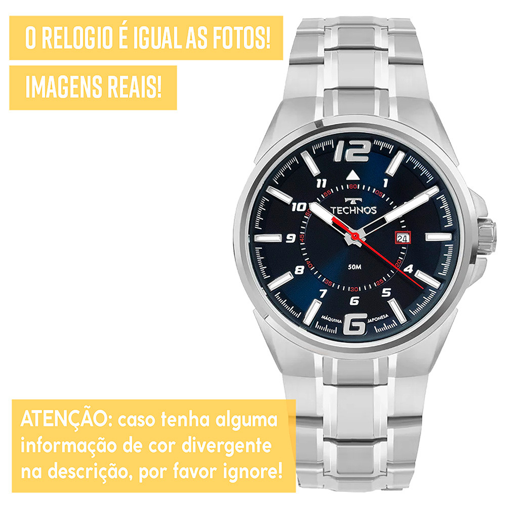 Procurando um presente perfeito? Encontrou! Dê o lindo Technos de presente para você mesmo, ou para alguém querido! *1 ANO DE GARANTIA TECHNOS - Produto com NOTA FISCAL* Atuamos somente com produtos 100% ORIGINAIS! Leve em um especialista de sua região para comprovar. Ficha Técnica PROVA D'ÁGUA: Sim – selo de resistência 5 ATM (resistência até 50 metros de profundidade) MATERIAL DO VIDRO: Cristal mineral resistente a riscos MAQUINÁRIO: Analógico – quartzo - bateria MATERIAL DO RELÓGIO: Aço inoxidável COR DO FUNDO: Preto Medidas TAMANHO DA CAIXA (mostrador): 4,8 cm (48 mm) ESPESSURA DA CAIXA (mostrador): 1,1 cm (11 mm) LARGURA DA PULSEIRA: 2,2 cm (22 mm) CIRCUNFERÊNCIA DA PULSEIRA: 26 cm Funções Calendário Ponteiros fosforescentes Acompanha Relógio Technos, caixa original Technos, manual de instruções em português, certificado de garantia e nota fiscal. Nossos produtos são todos tratados com máximo cuidado, profissionalismo e atenção. Enviamos o seu relógio em uma embalagem reforçada, protegida por dentro e por fora. Caso não tenha gostado ou simplesmente se arrependeu, devolva o produto sem preocupações. Você tem 30 dias a partir do recebimento para devolvê-lo. COMPRE COM SEGURANÇA Revendedor autorizado Technos