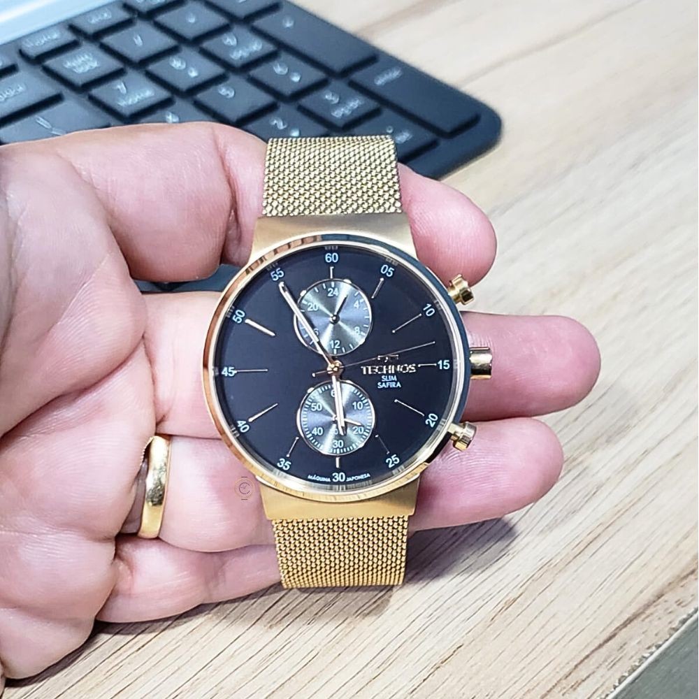 SOBRE A EMPRESA: Somos Relógios Campana, uma empresa especializada em vendas online, revendedora autorizada das maiores marcas do mercado. Trabalhamos apenas com relógios originais com garantia de fábrica. Comprando conosco você tem a segurança que receberá seu produto nas seguintes condições: => REVENDEDOR AUTORIZADO => PRODUTO ORIGINAL => GARANTIA DO FABRICANTE => PRODUTO NOVO => EMBALAGEM ORIGINAL DO PRODUTO => MANUAL DE INSTRUÇÕES => CERTIFICADO DE GARANTIA => NOTA FISCAL => RELÓGIO A PRONTA-ENTREGA SOBRE O PRODUTO: Com design minimalista, o lançamento da linha Slim reinventa o conceito clássico da simplicidade para apresentar um acabamentos moderno e sofisticado, como a assinatura de linha no mostrador de cor preta. Com caixa fina, pulseira de mesh de aço e Vidro de Safira, é uma coleção que, além de ser leve e confortável em qualquer pulso, entrega um vidro com alta resistência a riscos e arranhões. Produto 100% em aço inoxidável em banho dourado, com cronógrafo, máquina quartz japonesa Miyota e resistência à água de 50m. Especificações: Marca: Technos Modelo: VD36AA/1P Tipo de relógio: Analógica Gênero: Masculino Cor da caixa: Dourado Cor da pulseira: Dourado Estilo: Casual Alarme: Não Cronógrafo: Sim Calendário: Não Luz: Não – ponteiros fluorescentes Resistência à água: Sim – 5 ATM = 50 metros Tipo de fecho: Fivela de gancho Material da Caixa: Aço Inoxidável Material da Pulseira: Mesh de Aço Inoxidável Características do vidro: Safira Tamanho da caixa: 40 mm Espessura da caixa: 10 mm Comprimento da pulseira: 22 cm Largura da pulseira: 20 mm Tampa do fundo: Pressão Peso: 81 Gramas Alimentação: Bateria Conteúdo da Embalagem: Relógio, nota fiscal, certificado garantia e manual de instruções Garantia do Fabricante: 12 meses Fabricante: Technos da Amazônia Ind e Com S/A Ficou alguma dúvida? Estamos à disposição no campo de mensagens!