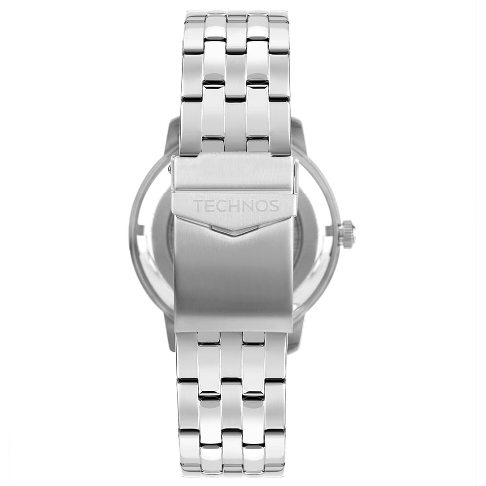 Relógio Technos Automático com caixa e pulseira de aço inoxidável. O modelo apresenta fundo de vidro, com maquinismo automático skeleton visível no mostrador, além da pulseira de elos 5 links. Produto com tamanho de caixa 46mm e resistência à água de 50m.