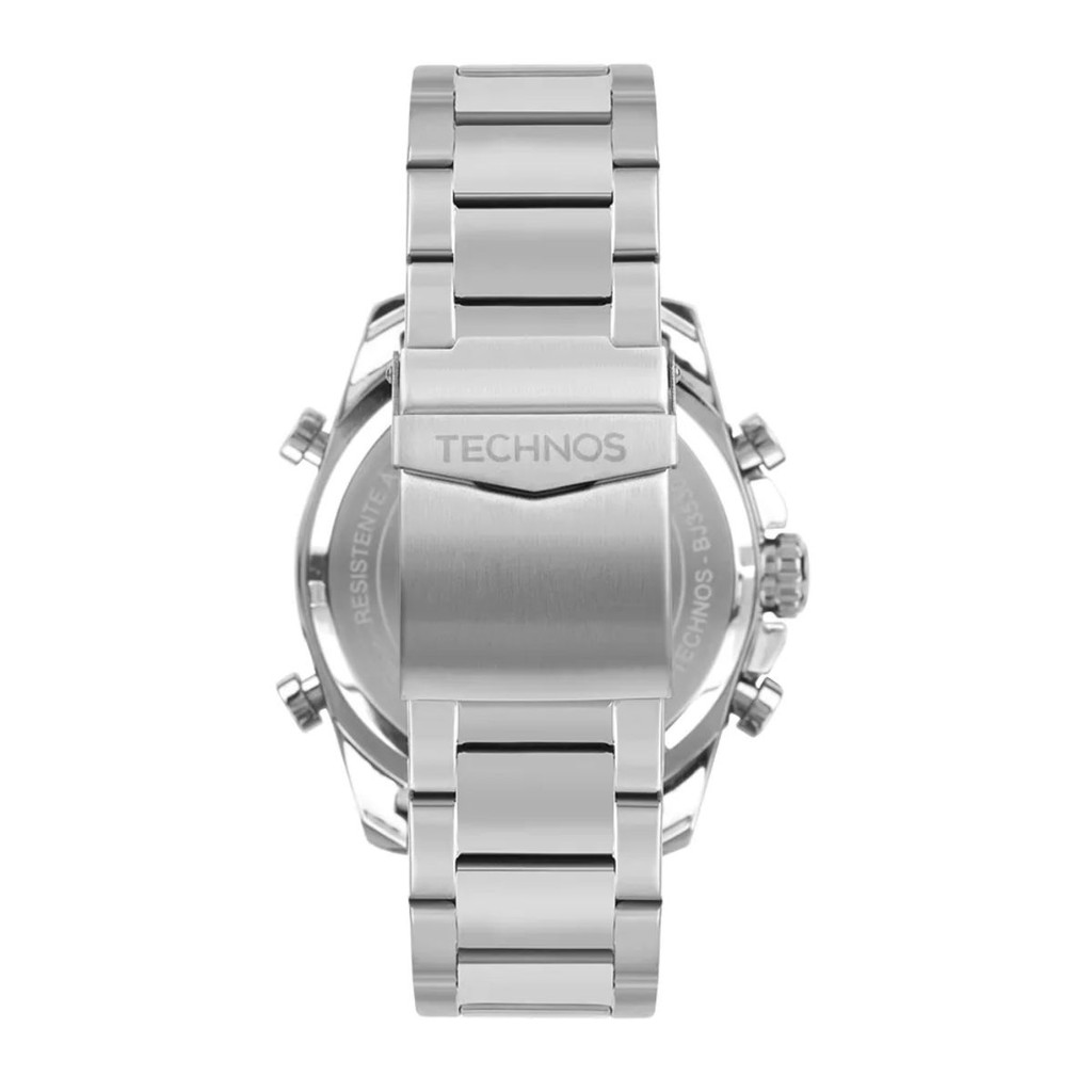 Especificações Técnicas: Marca: Technos Referência: BJ3530AF1A Gênero: Masculino Cor da Pulseira: Prata Cor da Caixa: Prata com aro azul Material da Pulseira: Aço inoxidável Material da Caixa: Aço inoxidável Tamanho da Caixa: 48 mm Resistência à água: 100 metros / 10 ATM Tipo de movimento: Analógico-Digital (AnaDigi) Características do vidro: Cristal mineral Funções adicionais: Calendário, cronômetro, alarme, iluminação