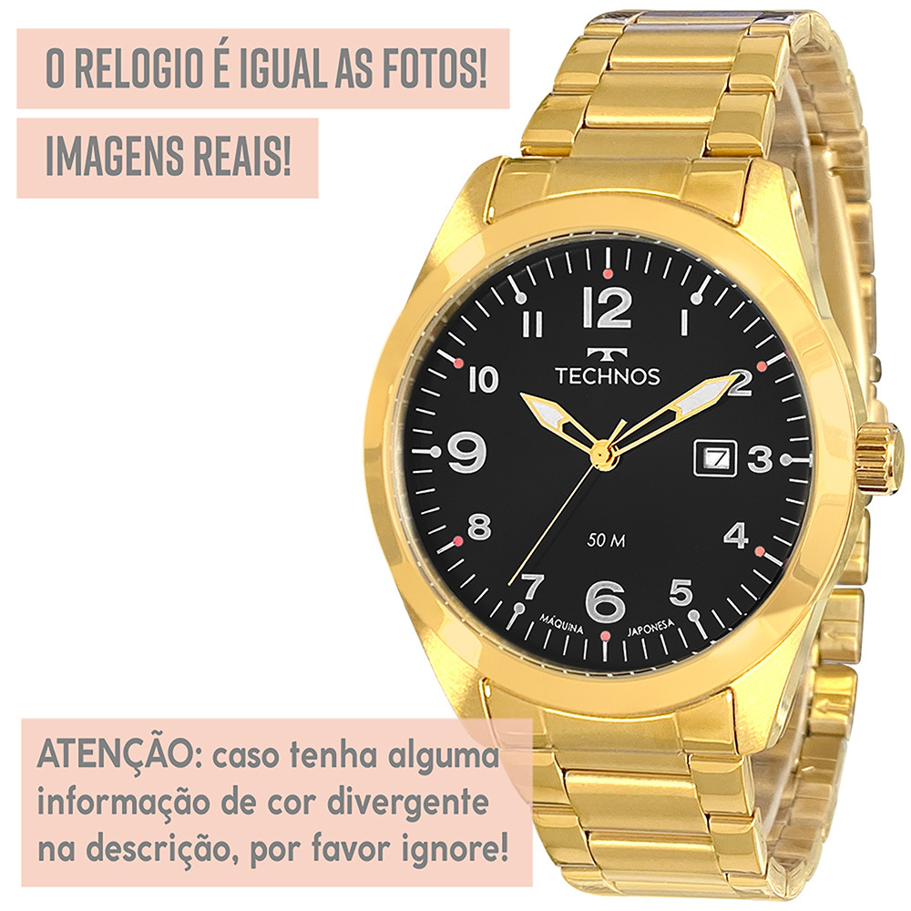 Procurando um presente perfeito? Encontrou! Dê o lindo Technos de presente para você mesmo, ou para alguém querido! *1 ANO DE GARANTIA TECHNOS - Produto com NOTA FISCAL* Atuamos somente com produtos 100% ORIGINAIS! Leve em um especialista de sua região para comprovar. Ficha Técnica PROVA D'ÁGUA: Sim - selo de resistência 5 ATM (resistência até 50 metros de profundidade) BANHADO A OURO: Sim MATERIAL DO VIDRO: Cristal mineral resistente a riscos MAQUINÁRIO: Analógico - quartzo - bateria MATERIAL DO RELÓGIO: Aço inoxidável COR DO FUNDO: Preto Medidas TAMANHO DA CAIXA (mostrador): 4,7 cm (47 mm) - tamanho médio ESPESSURA DA CAIXA (mostrador): 1,0 cm (10 mm) LARGURA DA PULSEIRA: 2,0 cm (20 mm) CIRCUNFERÊNCIA DA PULSEIRA: 26 cm Funções Calendário Ponteiros fosforescentes Acompanha Relógio Technos, caixa original Technos, manual de instruções em português, certificado de garantia e nota fiscal. Nossos produtos são todos tratados com máximo cuidado, profissionalismo e atenção. Enviamos o seu relógio em uma embalagem reforçada, protegida por dentro e por fora. Caso não tenha gostado ou simplesmente se arrependeu, devolva o produto sem preocupações. Você tem 30 dias a partir do recebimento para devolvê-lo. COMPRE COM SEGURANÇA Revendedor autorizado Technos