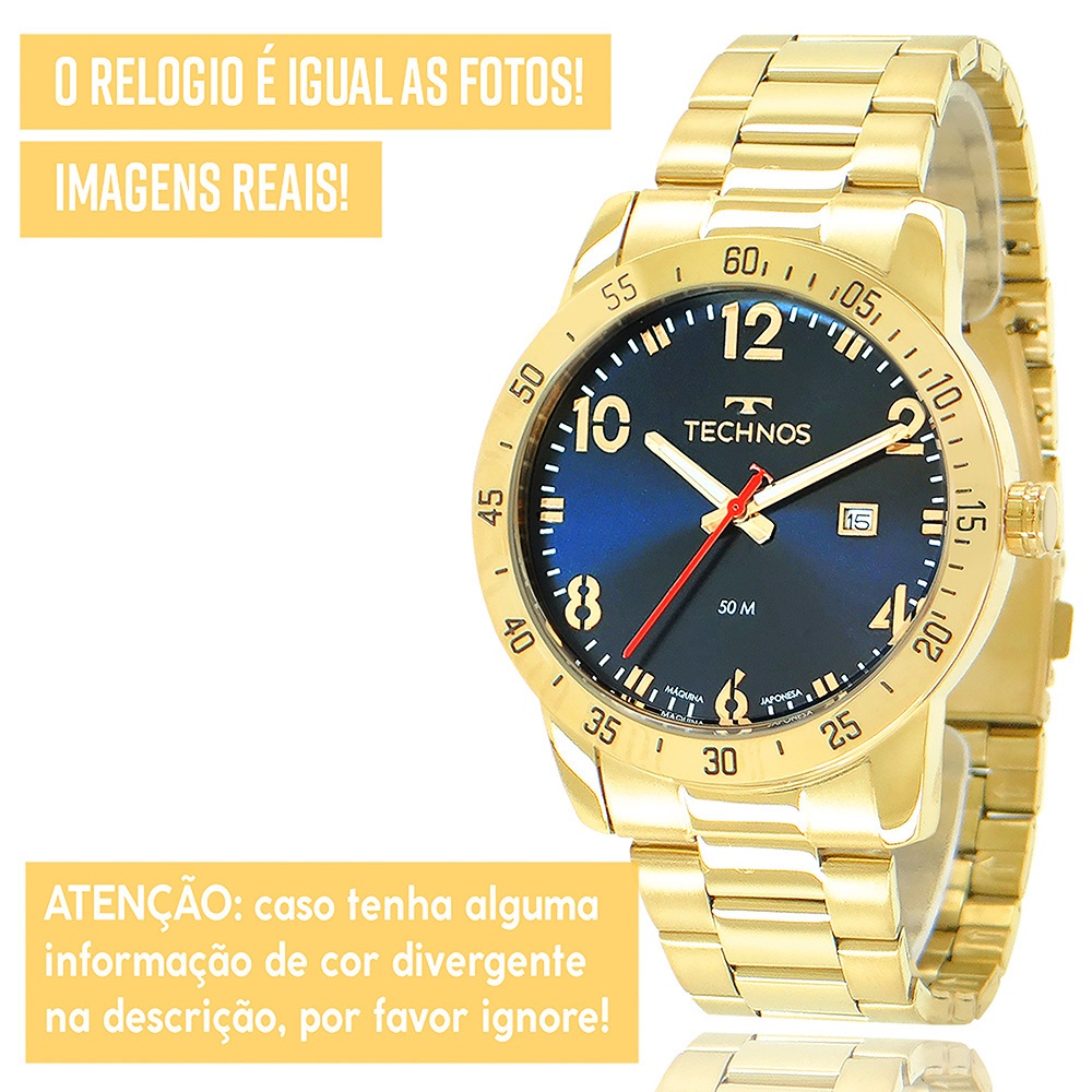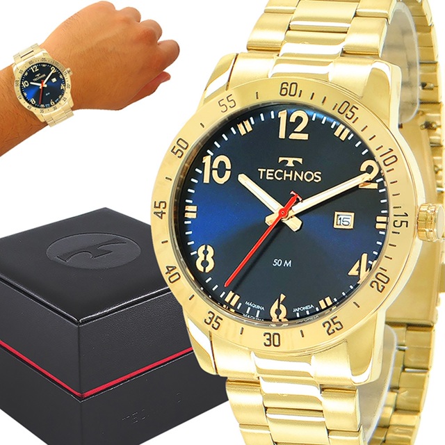 Procurando um presente perfeito? Encontrou! Dê um lindo Technos de presente para você mesmo, ou para alguém querido! *1 ANO DE GARANTIA TECHNOS - Produto com NOTA FISCAL* Atuamos somente com produtos 100% ORIGINAIS! Leve em um especialista de sua região para comprovar. Ficha Técnica PROVA D'ÁGUA: Sim - selo de resistência 5 ATM (resistência até 50 metros de profundidade)= BANHADO A OURO: Sim MATERIAL DO VIDRO: Cristal mineral resistente a riscos MAQUINÁRIO: Analógico - quartzo - bateria MATERIAL DO RELÓGIO: Aço inoxidável COR DO FUNDO: Azul Medidas TAMANHO DA CAIXA (mostrador): 4,3 cm (43 mm) ESPESSURA DA CAIXA (mostrador): 1,2 cm (12 mm) LARGURA DA PULSEIRA: 2,0 cm (20 mm) CIRCUNFERÊNCIA DA PULSEIRA: 26 cm Funções Calendário Ponteiros fosforescentes Acompanha Relógio Technos, caixa original Technos, manual de instruções em português, certificado de garantia e nota fiscal. Nossos produtos são todos tratados com máximo cuidado, profissionalismo e atenção. Enviamos o seu relógio em uma embalagem reforçada, protegida por dentro e por fora. Caso não tenha gostado ou simplesmente se arrependeu, devolva o produto sem preocupações. Você tem 30 dias a partir do recebimento para devolvê-lo. COMPRE COM SEGURANÇA Revendedor autorizado Technos