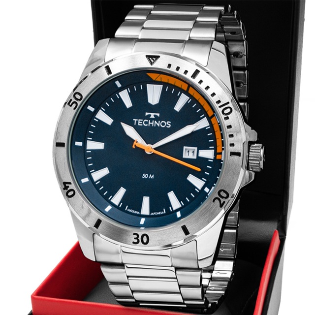 Compre o Relógio Technos Masculino Militar 2115NAQ/1A na Eclock, a maior loja de relógios do Brasil! Vamos conhecer um pouco mais sobre o produto? Possui mecanismo Analógico, a pulseira é na cor Prata, fabricada em Aço, com 23 cm de comprimento e possui Fecho Dobrável com Dois Botões. A Caixa (peça onde fica o mostrador) é fabricada em Aço, possui fundo do tipo Rosqueada, mede 4,4 cm de diâmetro, sem considerar a coroa, e 1,1 cm de espessura, o que é considerado tamanho Médio para relógios do gênero Masculino. O Relógio Technos Masculino Militar 2115NAQ/1A tem nível de resistência à água especificado em 5 ATM. Com relação as funções adicionais do relógio: possui Calendário Analógico com Data e Marcadores com Illuminator. É Fabricado por Technos da Amazonia Indústria e Comércio. CNPJ: 04628426/0001-45 e tem Garantia de 1 Ano com o Fornecedor.