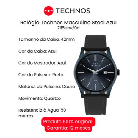 Relógio Technos Masculino Steel Azul - 2115UBV/0A Elegância e resistência se unem neste relógio masculino Technos Steel Azul. Com design sofisticado e detalhes que fazem a diferença, ele é perfeito para quem busca estilo e funcionalidade no dia a dia. - Tipo de Banho: Azul - Tamanho da Caixa: 42mm - Formato da Caixa: Redondo - Cor da Caixa: Azul - Cor do Mostrador: Azul - Material da Pulseira: Couro - Cor da Pulseira: Preto - Movimento: Quartzo - Resistência à Água: Até 50m - Funções: Calendário - Garantia: 12 meses - Produto 100% original com garantia de fábrica O Technos Steel Azul é a união perfeita entre sofisticação e funcionalidade, pronto para complementar seu estilo com elegância. Compre este lindo Relógio na Loja Oficial da Technos na Shopee com a segurança que só uma Loja de Fábrica pode oferecer. LOJA DE FÁBRICA – PRONTA ENTREGA COM ENVIO IMEDIATO.