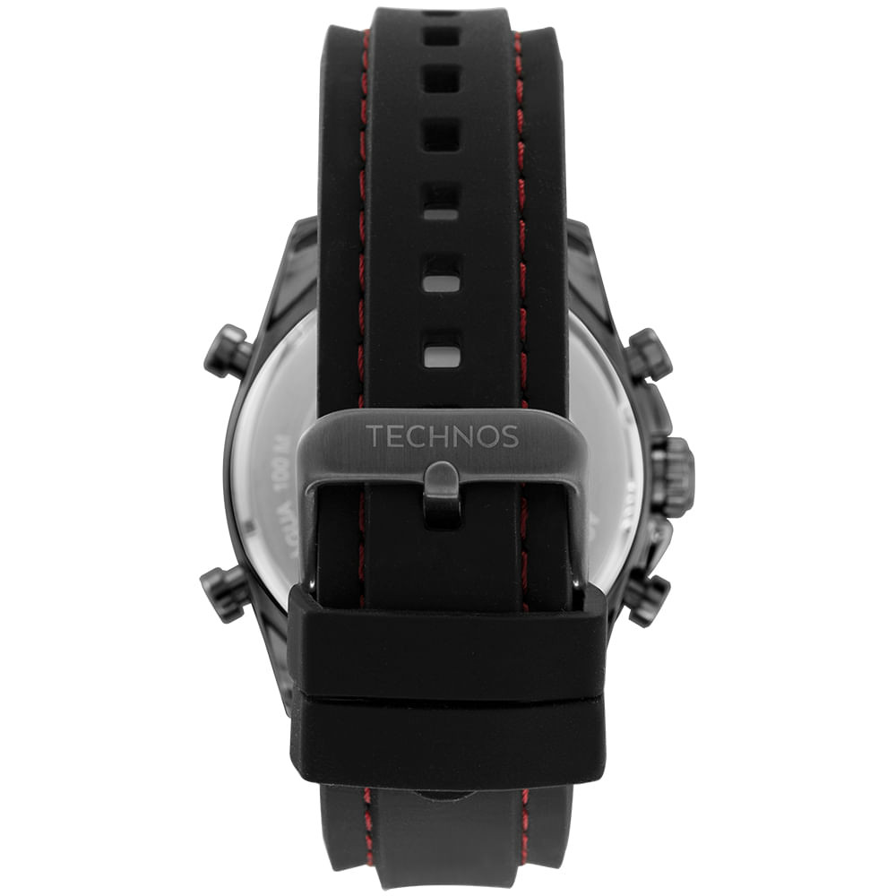 Relógio Technos Digiana masculino com caixa de aço inox em banho grafite, pulseira de silicone preta, aro com marcações, módulo digital e maquinismo analógico. Seu mostrador possui detalhes em camadas, dando profundidade à peça, e sua caixa é robusta, o que transmite a essência imponente do relógio. Possui detalhes em vermelho, resistência à água de 10 ATM e tamanho de caixa 48mm.