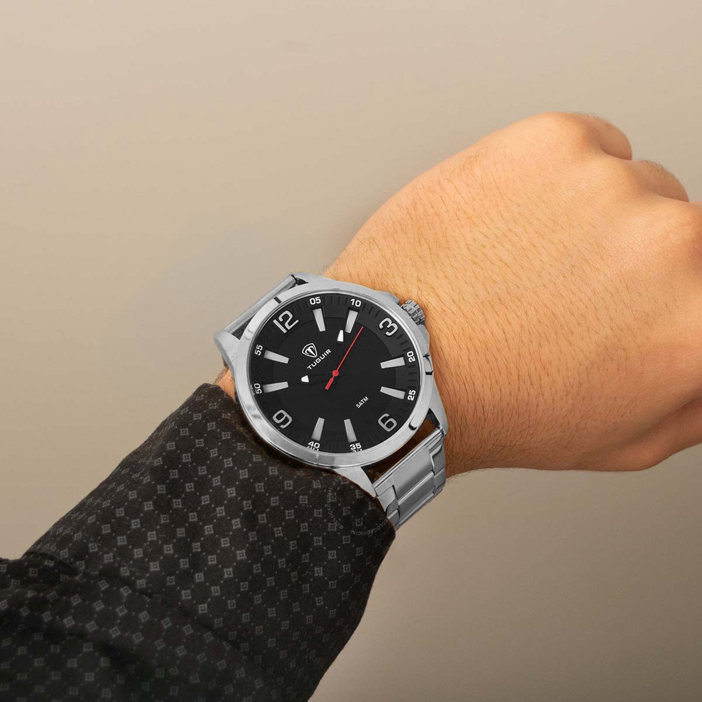 Compre o Relógio Tuguir Masculino TG30068 na Eclock, a maior loja de relógios do Brasil! Vamos conhecer um pouco mais sobre o produto? Possui mecanismo Analógico, a pulseira é na cor Prata, fabricada em Metal, com 24 cm de comprimento e possui Fecho Dobrável com Trava. A Caixa (peça onde fica o mostrador) é fabricada em Metal, possui fundo do tipo De pressão, mede 4,6 cm de diâmetro, sem considerar a coroa, e 1,4 cm de espessura, o que é considerado tamanho Grande para relógios do gênero Masculino. O Relógio Tuguir Masculino TG30068 tem nível de resistência à água especificado em 5 ATM. Com relação as funções adicionais do relógio: possui Marcadores com Illuminator. É Fabricado por Tuguir Relógios e tem Garantia de 1 Ano com o Fornecedor.