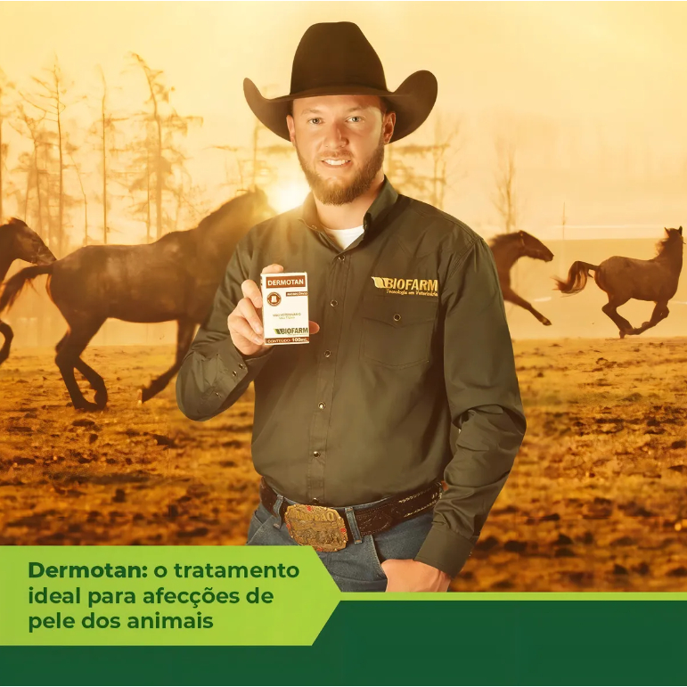 A ESTRELA PET OFERECE A VOCÊ O DERMOTAN 100ML, fabricado pela Biofarm. O Remédio Antimicótico para Cachorros e Gatos Dermotan 100ml é a solução ideal para manter a saúde da pele dos seus animais de estimação. Desenvolvido pelo laboratório Biofarm, este tratamento líquido é eficaz contra alergias, queda de pelos, dermatites, fungos e micoses. Com um peso máximo recomendado de 300 kg e mínimo de 1 kg, é adequado para cães, gatos, equinos, bovinos, ovinos e caprinos. A fórmula do Dermotan é resistente a água e proporciona um efeito duradouro de até três meses. O produto vem em uma embalagem de 100 ml, facilitando a aplicação e o manuseio. Além disso, o formato ajustável permite que você adapte o tratamento as necessidades específicas do seu animal. O Dermotan é prático e fácil de usar. A saúde e o bem-estar do seu pet são prioridades, e este remédio antimicótico é uma escolha confiável para prevenir e tratar problemas de pele. Invista na qualidade de vida do seu animal com Dermotan. MODO DE USAR E POSOLOGIA_______________ Uso tópico, pronto para uso. Após limpeza do local infectado, aplicar DERMOTAN direcionando a válvula spray para o local a ser tratado. Se necessário, utilizar algodão ou pincel como auxiliar no momento da aplicação. Repetir a aplicação duas vezes ao dia ou a critério do Médico Veterinário.