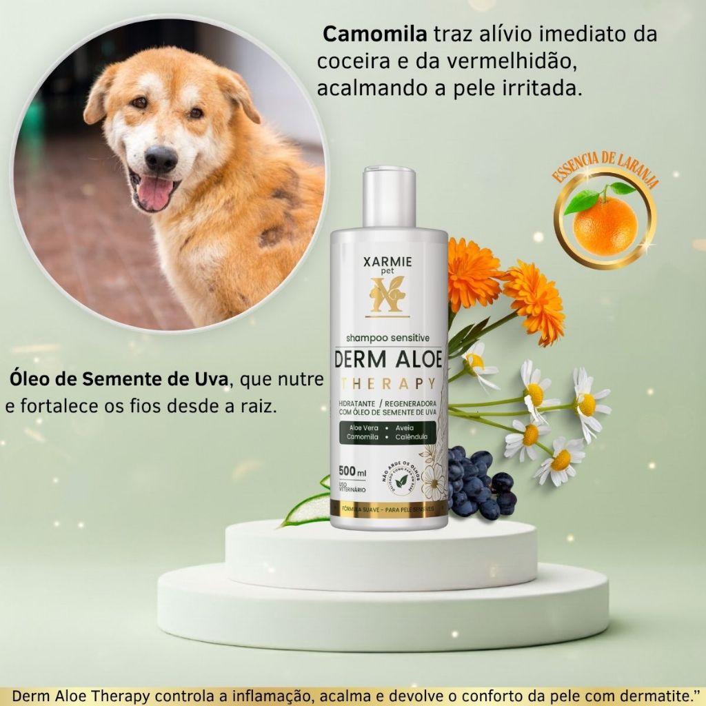 🐾 Shampoo PET Tratamento Dermatite Atópica, Alergias e Feridas DERM ALOE THERAPY 500ml O DERM ALOE THERAPY foi desenvolvido para tratar os casos mais difíceis de dermatite atópica, alergias de pele e feridas causadas por coceira excessiva. Sua fórmula natural e terapêutica age profundamente, aliviando a inflamação, regenerando a pele e restaurando o conforto do seu pet. Cada banho é um tratamento que reduz a coceira, cicatriza e devolve a vitalidade da pelagem. _______________________________________________________________________________________________________________ 🚨 Principais Problemas Que Ele Resolve ✔️ Dermatite Atópica e Alergias de Pele — combate inflamações e reduz vermelhidão. ✔️ Feridas e Crostas — acelera a cicatrização e impede novas lesões. ✔️ Coceira intensa e irritação constante — acalma e refresca a pele sensível. ✔️ Descamação, ressecamento e mau odor — limpa suavemente e restaura a hidratação natural. ✔️ Pelos fracos e opacos — nutre e fortalece desde a raiz, devolvendo brilho e maciez. ____________________________________________________________________________________________________ 🌿 Benefícios da Fórmula & Como Cada Ativo Atua Aloe Vera • Estimula a regeneração da pele e cicatriza feridas com rapidez. • Hidrata profundamente e restaura o equilíbrio natural da barreira cutânea. _____________________________________________________________________________ Camomila • Reduz inflamações e coceiras causadas por dermatite. • Proporciona sensação de alívio e frescor imediato. _______________________________________________________________________________ Calêndula • Potente cicatrizante natural. • Acelera a recuperação da pele ferida e reduz a sensibilidade. _____________________________________________________________________________ Aveia Coloidal • Cria uma película protetora que retém a hidratação. • Suaviza a pele e diminui o ardor e a coceira. __________________________________________________________________________ Óleo de Semente de Uva • Rico em antioxidantes e vitaminas. • Nutre sem deixar oleoso, devolvendo brilho e maciez à pelagem. ___________________________________________________________________________ 💧 A Sinergia que Cura de Dentro Pra Fora A união desses 5 ativos forma um tratamento natural e eficaz contra a dermatite e as alergias caninas. Enquanto a Aloe Vera regenera as feridas, a Calêndula cicatriza, a Camomila acalma, a Aveia protege e o Óleo de Semente de Uva nutre profundamente. ________________________________________________________________________________________________ O resultado? Uma pele saudável, sem coceiras, e um pelo bonito e cheio de vida. É o tratamento mais completo e seguro para cães com pele sensível ou lesionada. ________________________________________________________________________________________________ ❤️ Seu Pet Não Precisa Mais Sofrer com Feridas e Coceiras A dermatite atópica causa dor, desconforto e sofrimento — mas você pode mudar isso agora. Proporcione alívio real, conforto e recuperação visível em poucos banhos. 👉 Adicione ao carrinho e veja seu pet voltar a se sentir bem! DERM ALOE THERAPY– Alívio, Cicatrização e Cuidado em Cada Gota. 🐶💚