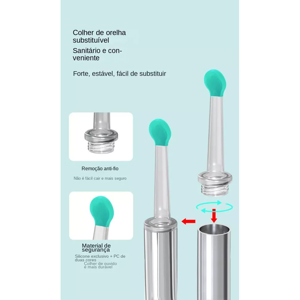 SPNewQ: Pronta Entrega ! Removedor De Cera De Ouvido LED Otoscópio De Lente WIFI DESCRIÇÃO: Modelo do produto: colher visual NE7 Frequência de trabalho: 2.4G Tensão de trabalho: 3,7 V Potência máxima: 0,3W Material do cano: ABS Interface de entrada: TIPO-C Parâmetros de entrada: 5V/0,2A Cor do produto: preto/branco Tipo de fonte de alimentação: polímero Vida útil da bateria: cerca de 50 minutos Ambiente de trabalho: -10--50 graus Capacidade da bateria: 130mAh Especificações do produto: comprimento 145mm Interface de carregamento: TIPO-C Software de suporte: APP personalizado Tipo de interruptor: interruptor de cabeça da lâmpada Modo de trabalho: pressione e segure por dois segundos para ligar/desligar Proteção de carga e descarga: IC integrado de sobrecarga e descarga excessiva para prolongar a vida útil da bateria Modo de carregamento: o LED pisca em vermelho durante o carregamento e permanece vermelho quando totalmente carregado. Peso líquido do produto: 13g Peso bruto do produto: 47g Tamanho do conjunto único: 16,4*7*1,7cm Quantidade por caixa: 200 conjuntos Tamanho da caixa única: 36,5*33,8*38cm Acessórios do produto: colher de ouvido, cabo de carregamento TYPE-C, 6 cabeças de colher de silicone, manual de instruções, caixa colorida