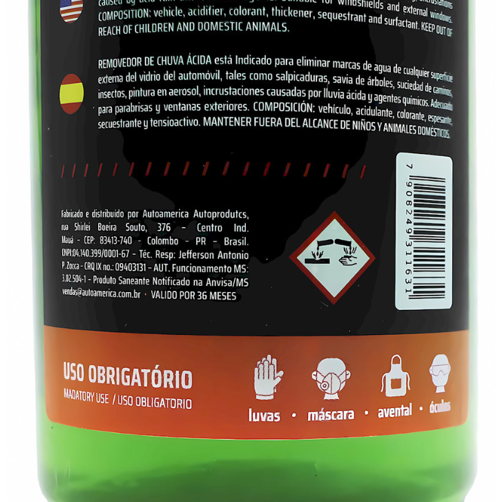 Removedor De Chuva Ácida 500ml - Autoamerica É indicado para remover marcas dágua de qualquer superfície externa de vidro automotivo, como respingos, seiva de árvores, sujeira da estrada, insetos, incrustações provocadas por chuva ácida e agentes químicos. Indicado para pára-brisas e janelas externas. BENEFICIOS: Pronto para o uso; Remove manchas difíceis; Restaura a transparência; MODO DE USAR: Aplique o produto em um aplicador de microfibra. Com pressão moderada, esfregue as superfícies externas de vidro, em áreas de 50x50cm, fazendo movimentos orientados, na vertical e horizontal. Antes de secar, enxágue com muita água. Se ainda houver marcas, repita o processo. CONTÉUDO: 01 Removedor de Chuva Ácida 500ml Autoamerica