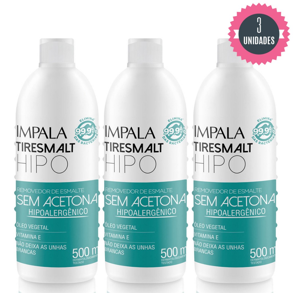 Removedor de Esmalte Sem Acetona Tiresmalt Hipo Impala 500ml. Com fórmula hipoalergênica e livre de acetona, o Removedor de esmaltes Tiresmalt Hipo minimiza possíveis alergias e mantém as unhas e cutículas hidratadas, evitando que fiquem fracas e quebradiças. Além disso, os produtos da linha Impala Tiresmalt eliminam 99,9% das bactérias, fazendo com que sua utilização antes e após a esmaltação auxilie na higiene e esterilização.