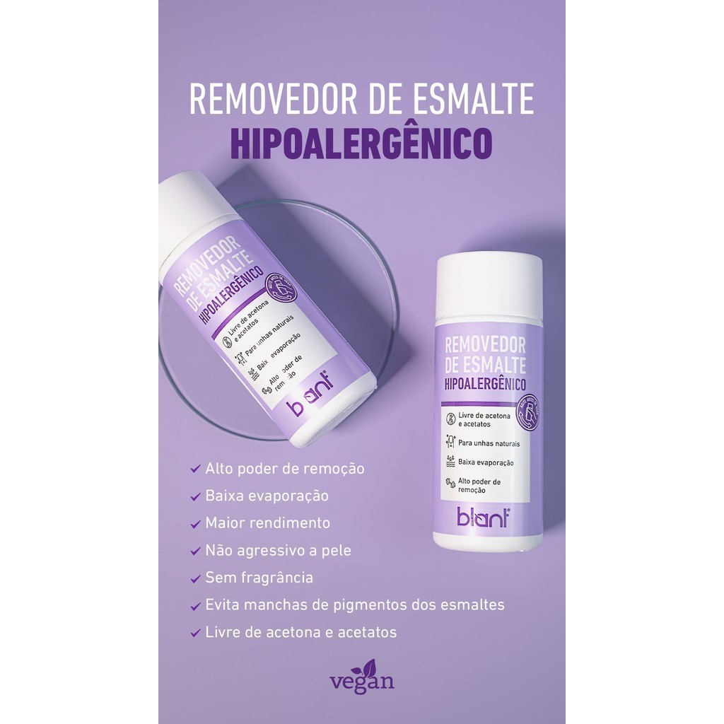 O Removedor de Esmalte Hipoalergênico Blant tem alto poder de remoção e maior rendimento. Além disso, proporciona hidratação, evitando o ressecamento e manchas brancas nas unhas e cutículas. Sua fórmula é suave e ecologicamente correta (biodegradável). Benefícios: Vegano Maior rendimento Não resseca a pele Evita a mancha de pigmentos dos esmaltes nas unhas Alto poder de remoção Ecologicamente correto Diferenciais do Removedor de esmalte hipoalergênico 80ML : Hipoalergênico Dermatologicamente testado Não nocivo à atmosfera Não agressivo a pele Biodegradável Baixa taxa de evaporação Diminui o atrito do algodão nas unhas Não contém fragrância OBSERVAÇÃO: Não pode ser usado em unhas artificiais / Sem contra indicação para grávidas e lactantes / Sem cheiro / 0 grau alergênico. Ativos: Álcool e carbonato de propileno Não contém: Acetona, tolueno, formaldeído, parabeno, acetato de etila, acetato de butila, DBP, fragrância e ingredientes de origem animal. Modo de Uso: Com um chumaço de algodão embebido com o produto, pressione e deslize suavemente sobre as unhas, da cutícula para a ponta. Por ser oleoso, lave bem as mãos após o uso com água e sabão para não interferir na fixação do esmalte. NÃO UTILIZAR EM UNHAS ARTIFICIAIS. Peso liquido: 80 ml