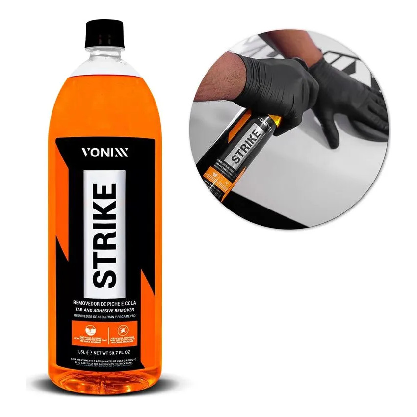 Removedor de Piche e Cola Strike 1,5 Litros VonixxDETALHES DO REMOVEDOR DE PICHE E COLA STRIKE 1,5 LITROS VONIXX:O Strike Removedor de Piche e Cola da Vonixx é um agente solubilizante, desenvolvido para remoção de piche e resíduos de colas deixados por adesivos e etiquetas autocolantes em geral. Sua composição balanceada remove grande parte de colas impregnadas e piche.BENEFÍCIOS:Não prejudica o vernizNão causa manchasRemove a maioria das colas de adesivosMODO DE USO:1. Pronto uso. Pulverize uma pequena quantidade do produto na área a ser limpa.2. Aguarde 1 minuto e esfregue o produto com ajuda de um pincel ou pano de microfibra até sentir o desprendimento da contaminação.3. Pulverize água em abundância e continue esfregando para a remoção total do resíduo.4. Seque a peça em seguida com uma microfibra limpa e seca.Obs. Se necessário repita a operação; o produto tem afinidade com a a maioria de tipos de colas de adesivos, porém é necessário um pequeno teste antes para ter a certeza da compatibilidade do produto com a contaminação.CONTEÚDO:1,5 LitrosRemovedor de Piche e Cola Strike 1,5 Litros Vonixx
