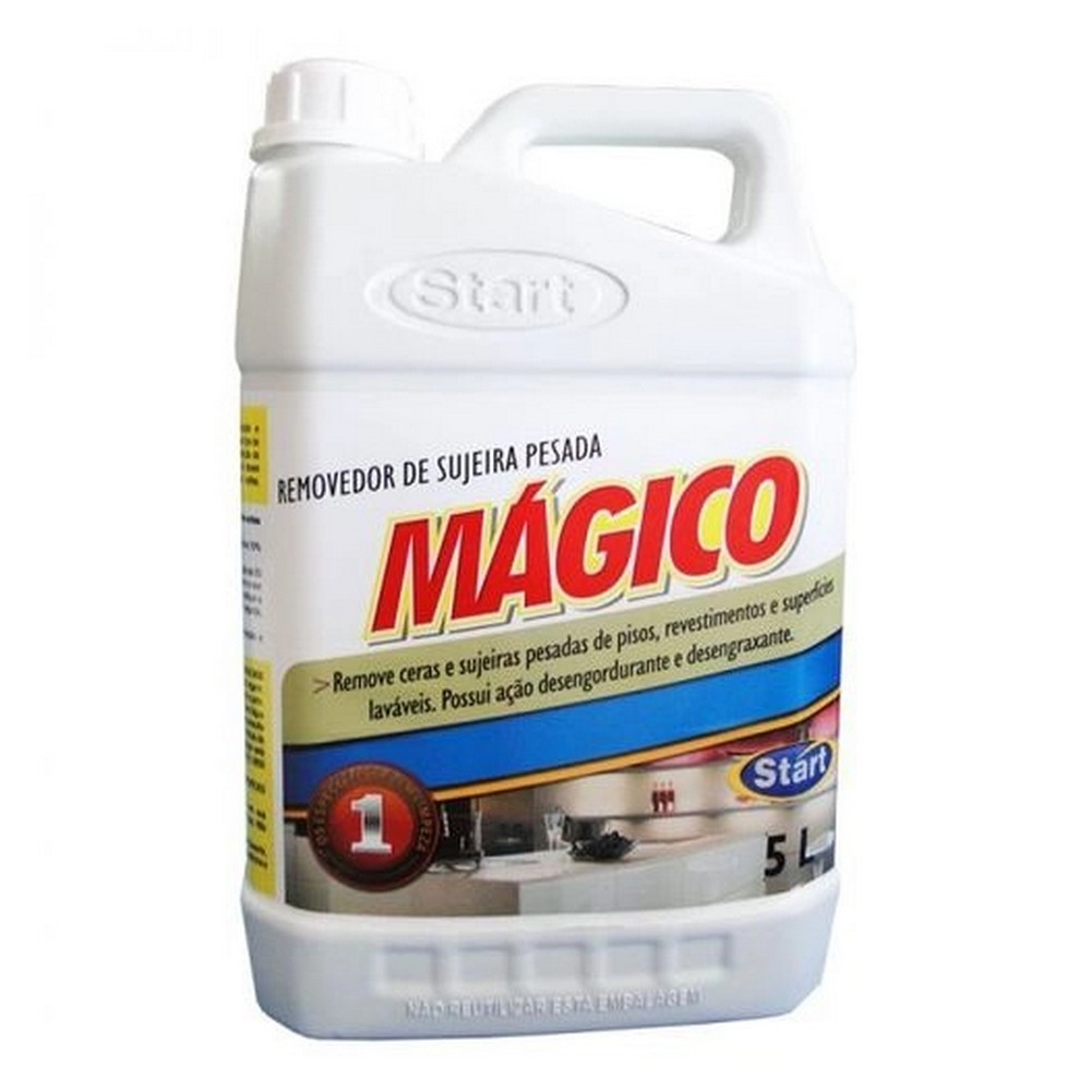 O Removedor de cera Mágico Start é um excelente produto com alto poder de emulsificação e saponificação de sujeira e graxa. Dessa forma podendo ser utilizado em qualquer tipo de piso encardidos, remoção de sujeiras pesadas (ceras antigas,impermeabilizantes acrílicos e bases seladoras) e como desengordurante. Excelente limpador de coifas, fogões e até mesmo desentupir pia. Modo de uso: Recomenda-se testar em uma pequena área antes de usar o produto. Desengraxante e Desengordurante: Utilize uma solução de 20 a 40% (ou seja, dilua de 2 a 4L em 10L de água) ou de acordo com o teor de sujidade a ser removido. Molhe a superfície a ser limpa e aplique a solução. Deixe agir por 5 minutos, esfregue um pouco e em seguida enxague com água em abundância. Embalagem: Galão de 5 litros