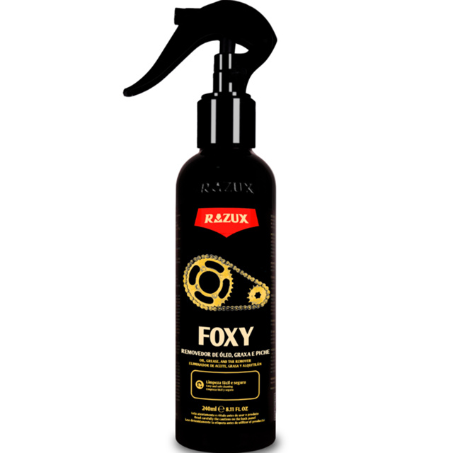 FOXY REMOVEDOR DE ÓLEO, GRAXA E PICHE 240ML RAZUX DESCRIÇÃO: Fórmula inovadora excepcional para remoção de óleo, graxa e piche. É a maneira mais eficiente e segura para limpeza de motor, kit de transmissão, pintura e demais partes da motocicleta. MODO DE USO: - Pulverize o produto sobre superfície a ser limpa. - Com o auxílio de um pincel de detalhamento, esfregue até soltar toda sujeira. - Faça o enxágue com água. - Se necessário repita a operação.