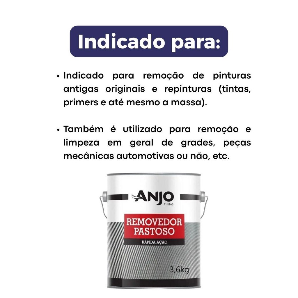 Indicado para remoção de pinturas antigas originais e repinturas (tintas, primers e até mesmo a massa). Também é utilizado para remoção e limpeza em geral de grades, peças mecânicas automotivas ou não, etc. Retire com um pincel ou espátula em abundância e aplique sobre o local a ser removido. Aguarde de 10 a 20 minutos ou até que o mesmo venha à reagir. Se necessário, fazer uma 2ª aplicação. Após a remoção e a raspagem, lavar bem a peça com água e limpar com Thinner 2750, Thinner ECO 2750 ou Solução Desengraxante Anjo. Não aplicar em locais muito quentes ou com incidência solar. Rendimento: 1kg de Removedor Pastoso para cada 1,43m² | 3,6kg de Removedor Pastoso para cada 5,2m². Abrir a lata com cuidado. O Removedor Pastoso forma gases. Diluição: Pronto para uso. *Imagens ilustrativas