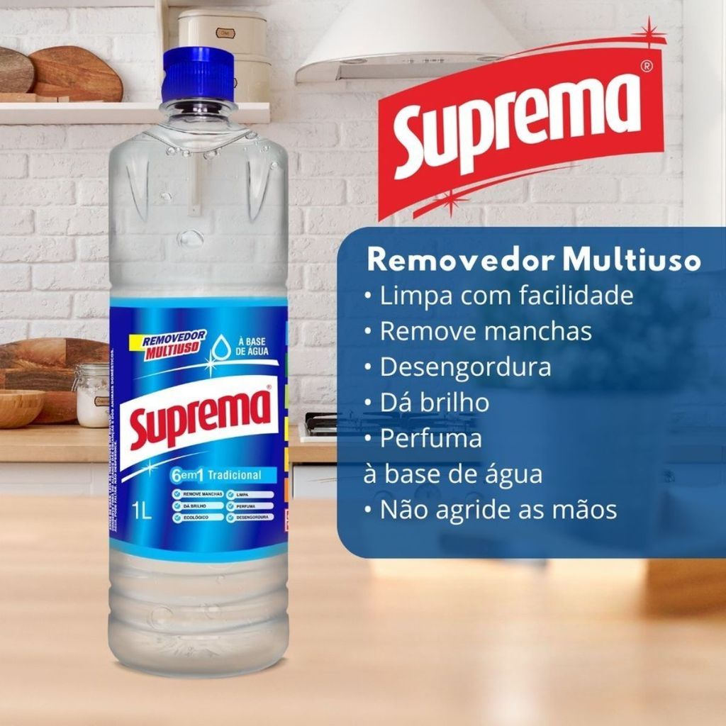 Removedor Tradicional 1L Suprema Desenvolvido para remover sujeiras difíceis sem esforço, sua fórmula à base de água é biodegradável, tornando-o uma escolha ecologicamente responsável.? Sua composição inclui butilglicol, um agente eficaz na remoção de sujeiras. Além disso, o removedor oferece benefícios adicionais, como brilho, perfume e desengorduramento, proporcionando uma limpeza completa e agradável. Indicação de Uso: - Ideal para diversas superfícies, como azulejos, metais, boxes e vidros. Modo de Uso: - Recomenda-se o uso de luvas durante a aplicação para proteger as mãos; - Sua aplicação é simples, basta aplicar o removedor puro em um pano seco e limpo, passar sobre a superfície desejada e aguardar a secagem. Fragrância: Tradicional