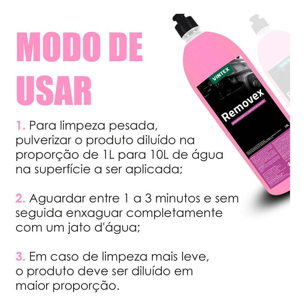 >>>>>>REMOVEX DESINCRUSTANTE 1,5LTS VINTEX<<<<<< Conteúdo da Embalagem: 01 (Um) Desincrustante Removex Vintex by Vonixx; Removex 1,5L Vintex; **Imagens e vídeo do anúncio são reais. Removex é um desengraxante e limpador de chassi de alto poder de ação, desenvolvido para remover sujeiras pesadas como óleo, graxa, barro, lama, matéria orgânica de chassi, carrocerias de ferro e madeira. Modo de usar: 1. Para limpeza pesada, pulverizar o produto diluído na proporção de 1L para 10L de água na superfície a ser aplicada; 2. Aguardar entre 1 a 3 minutos e sem seguida enxaguar completamente com um jato d'água; 3. Em caso de limpeza mais leve, o produto deve ser diluído em maior proporção.