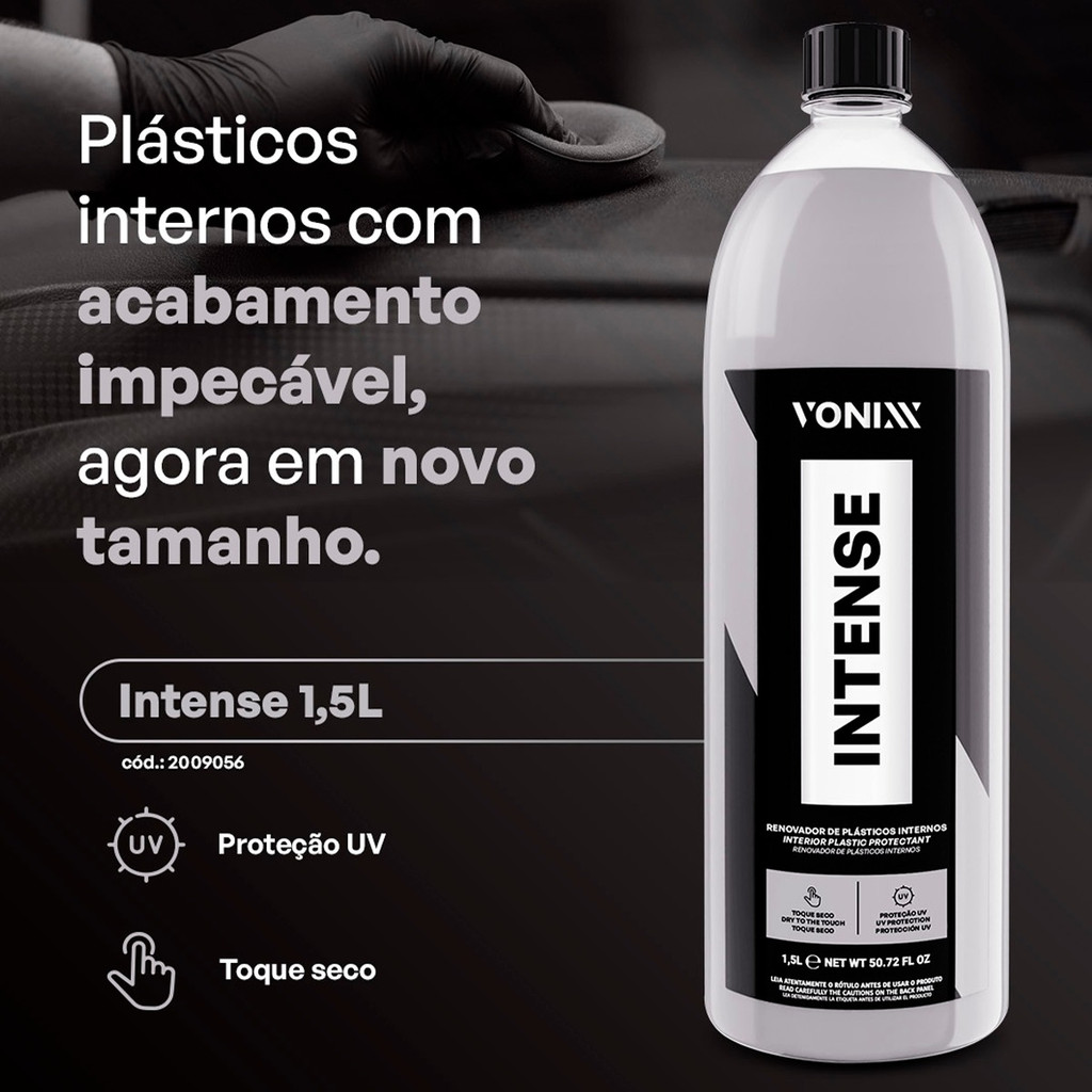 # INTENSE RENOVADOR DE PLÁSTICOS INTERNOS 1,5L VONIXX #-----------------------------------------------------------------------------------------------------Intense é um renovador de plásticos exclusivamente para consumidores de exigência extrema. Sua formulação balanceada promove acabamento natural, elegante e com toque seco, podendo durar até 6 meses. O produto deve ser utilizado especificamente na parte interna do automóvel, em superfícies como vinil e plásticos em geral.• TOQUE SECO• PROTEÇÃO UV# DURABILIDADEAté seis meses de proteção nos plásticos internos.# INFORMAÇÕES ADICIONAISIntense pode ser utilizado em painéis soft touch.Não recomendamos o uso do produto em plásticos externos e em couro.# MODO DE USO1. Certifique-se que a superfície esteja limpa e seca;2. Aplique uma pequena quantidade de produto de maneira uniforme com o auxílio de um aplicador de microfibra;3. Espalhe bem até o total preenchimento da peça.OBS: Se necessário, repita a operação. Qualquer mancha ou excesso poderá ser removido com uma toalha de microfibra limpa e seca.Estamos à disposição para maiores informações e respostas para as dúvidas.