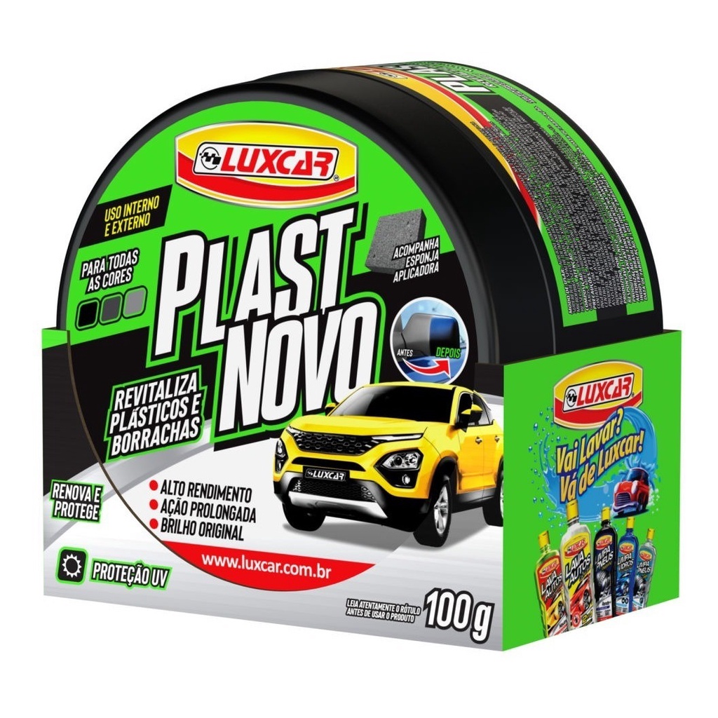Somos a Go! Mec Auto Peças, estamos no ramo de autopeças para veículos nacionais e importados há quase duas décadas, nosso estoque conta com uma variedade de 45000 itens. Todos os nossos produtos são novos, originais e com garantia. Renovador de Plásticos e Borrachas Luxcar 100 g O Renovador de Plásticos e Borrachas Luxcar foi especialmente desenvolvido para revitalizar, promover brilho e proteger todas as superfícies plásticas do seu veículo. Sua exclusiva fórmula reconstitui a camada plástica através de aditivos especiais, polímeros e protetivos, proporcionando um acabamento perfeito, com brilho seco e livre de poeira. Ideal para renovar e proteger: Plásticos, borrachas, vinil, para-choques, painel, maçaneta, capas de retrovisores, entre outros. Depois de tratada com o produto as superfícies plásticas do seu carro ficam protegidas das ações dos raios solares UV. e ação do tempo. Vantagens: • Alto rendimento. • Ação prolongada. • Brilho original. Modo de usar: Com a superfície limpa e seca, adicione uma pequena quantidade na esponja e aplique na superfície, espalhe de maneira econômica e uniforme, obtendo filme fino e seco em seguida se necessário, retire o excesso com um pano microfibra limpo e seco. Repita a aplicação se a superfície estiver muito ressecada. Validade 24 meses.