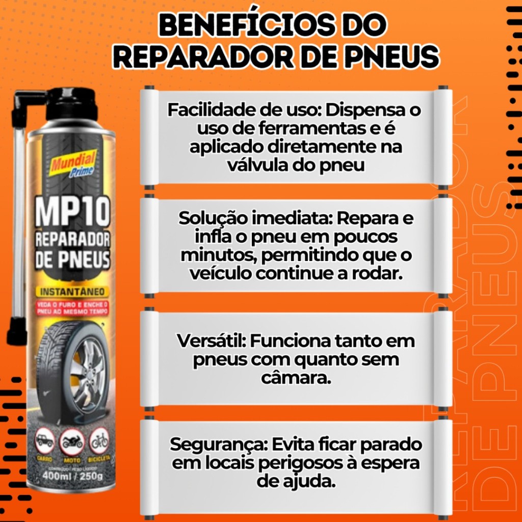 Reparador de Pneus 400ml MP10 Mundial Prime Com e Sem Câmara