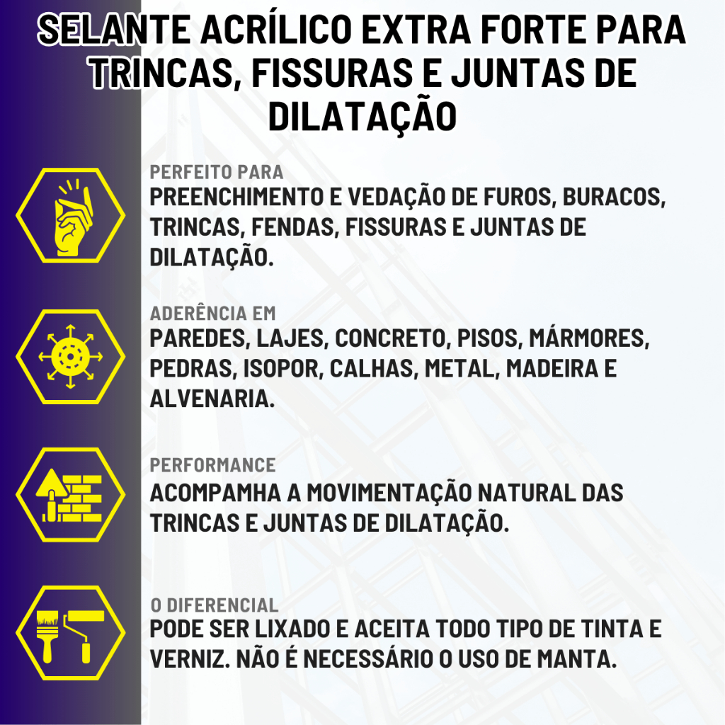 | Reparador e Preenchedor de TRINCAS E FISSURAS em muros, paredes pin... este produto | R$ 56,70 | 10% | 4.9/5 | 12 |