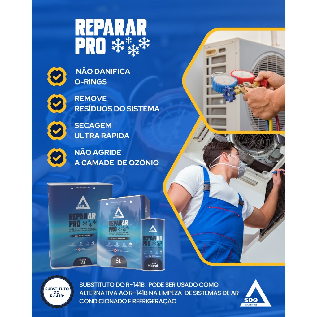 O RepararPro é um Fluído de Limpeza Substituto do 141B. Utilizado para manutenção de sistemas de ar-condicionado e refrigeração. Com secagem ultra-rápida, limpa o sistema sem deixar resíduos. Fluido de Limpeza Para Uso Refrigeração, substituto do R141B. Removedor de resíduos do sistemas de ar condicionado Utilização: Através de ferramenta de Flushing injetar o produto com uso de nitrogênio e circular no sistema até tirar todo o resíduo. Benefícios: - Secagem Rápida - Não danifica Orings - Remove os resíduos do sistema. RepararPro 900ml foi formulado especificamente para limpeza de sistemas de ar-condicionado e refrigeração, sendo compatível com todo o sistema, fazendo a limpeza sem danificar os componentes.
