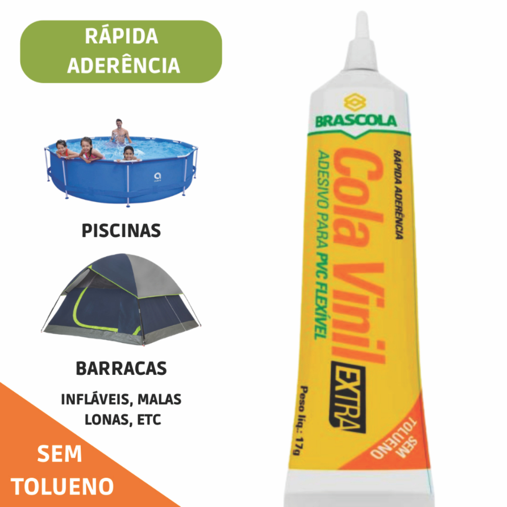 Kit- cola e remendo de lona para reparo em furos de Piscina e toldos Contem: 2 tubo de cola vinil EXTRA brascola 75 g 1 Tira de lona vinil de 100 cm x 40 cm A cola vinil brascola é um produto de alta qualidade especialmente desenvolvido e indicado para colagem de PVC flexível entre si. Ideal para reparos de piscinas, barracas de camping, lonas, boias infláveis, entre outros. Possui rápida aderência, flexibilidade e excelente resistência MODO DE USAR: As superfícies devem estar limpas e isentas de gordura ou umidade. Aplicar uma fina camada de Cola Vinil nas duas partes a serem coladas Deixar evaporar de 1 a 3 minutos Juntar as partes pressionando fortemente uma contra a outra. A secagem ocorre em 15 minutos - Aguardar 24 horas para obter a resistência total.