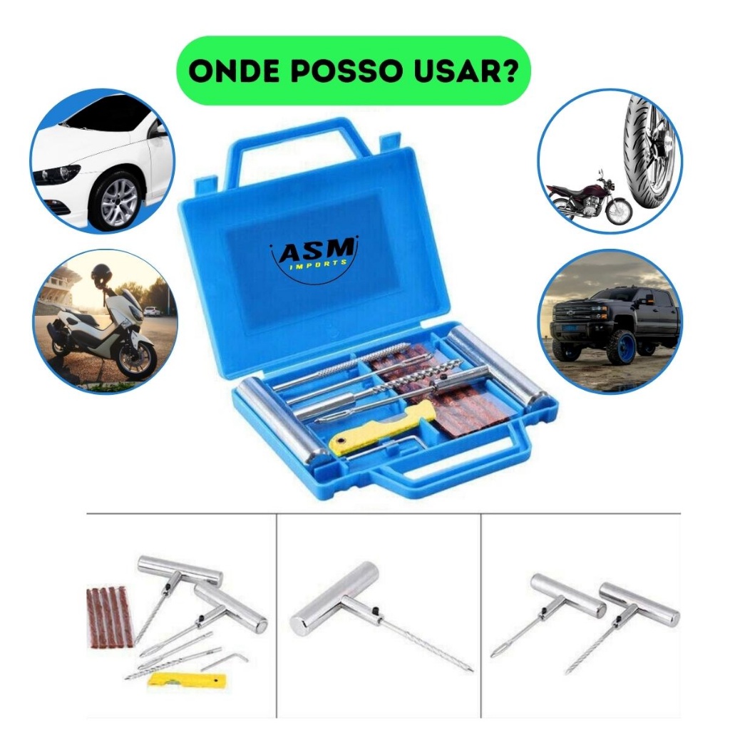 Reparo para pneus com maleta remendo de pneu 25 PÇS macarrão frio moto carro reparo Reparo com total de 32 Pçs + Maleta 1 Escareador de Ferro cromado + cabo 15 cm. 1 Escareador de Ferro cromado 1 Aplicador de reparo de Ferro cromado 15 cm + cabo. 1 Aplicador de reparo de Ferro cromado 1 Tubo de cola 12g 25 Reparos (comprimento 10 cm). 1 Estilete. 1 Maleta em plástico com travas. ATENÇÃO: Utilizar Em Pneus Sem Câmara. Não Repare Furos Maior Que 5mm Não Repare Furo Lateral Manter Em Local Fresco NAS IMAGENS MOSTRAMOS COMO UTILIZAR NO CASO DE DUVIDAS, NOS COMUNICAR NO CHAT DA LOJA! Obs: Sempre escarear bem , por a Cola e logo em seguida Remover o Excesso de Remendo ENVIAMOS O PRODUTO PARA TODO O BRASIL. Aguardamos sua compra Att asm imp ;)