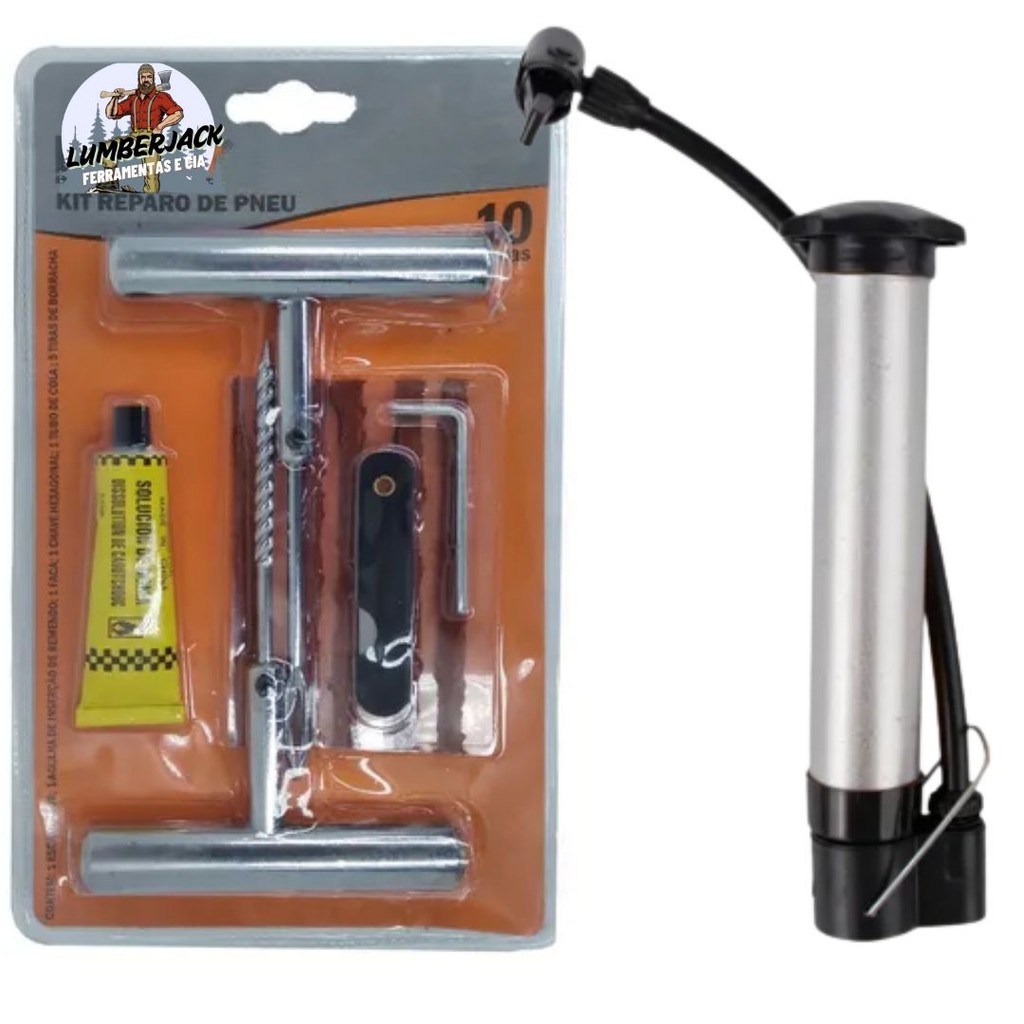 Reparo Pneu sem Camara para Carro e Moto Profissional de 10 Peças Refil Selante Macarrão Remendo + Bomba de Ar para Pneu
