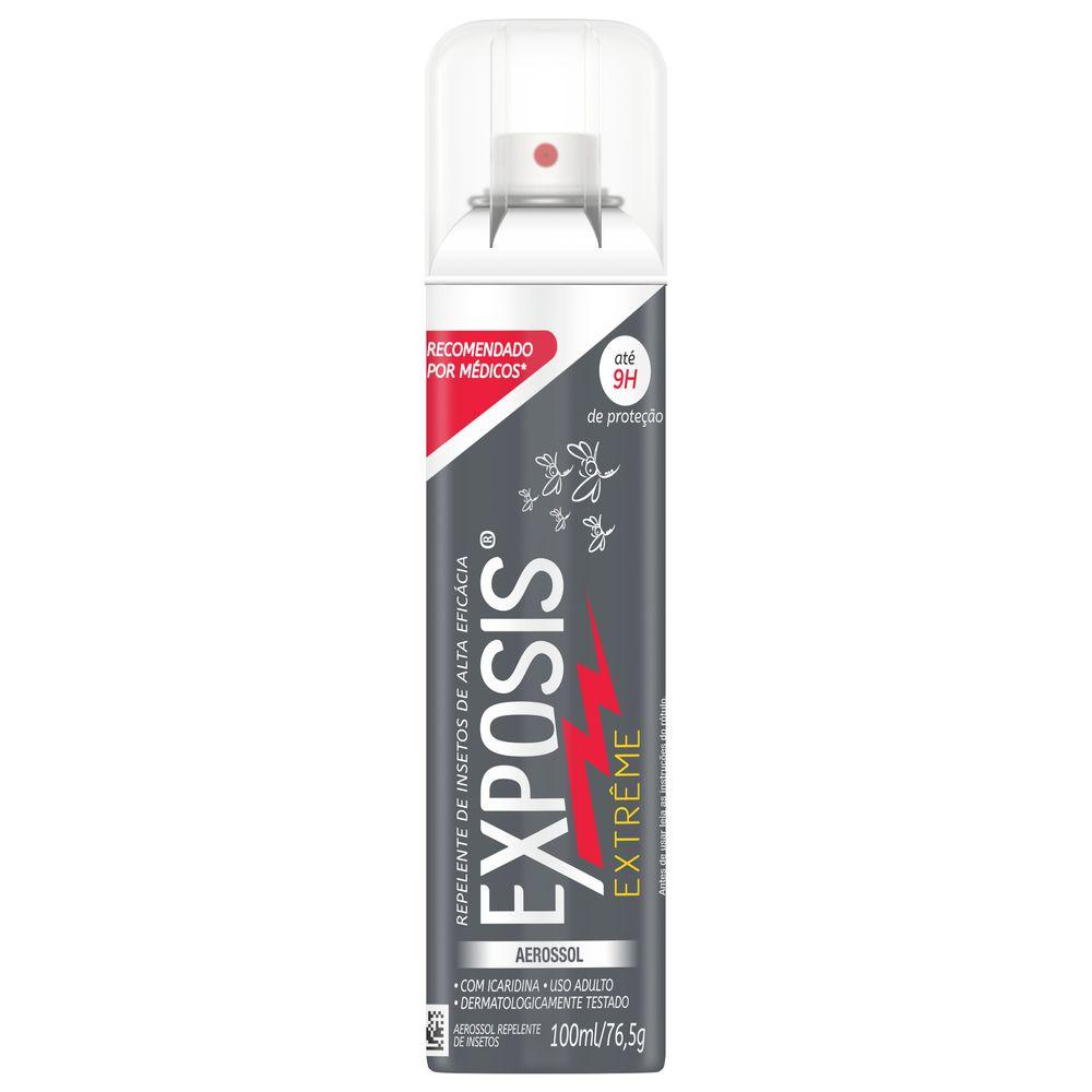 "Exposis é o repelente de insetos de alta eficácia mais recomendado por médicos. A linha Extreme Aerossol é dermatologicamente testada, contém icaridina e garante proteção por até 9h. Não tem cheiro. Eficaz contra mosquitos transmissores de doenças como Dengue, Zika, Chikungunya, Febre amarela e Filariose. É indicado para uso somente em crianças a partir dos 12 anos de idade. Aplique sobre a pele e espalhe uniformemente com as mãos. Não utilizar se a pele estiver irritada ou lesionada. Lavar as mãos com água e sabão após. Não aplicar na região dos olhos, boca e mucosas. Deve ser aplicado por adulto ou sob sua supervisão. Deve ser reaplicado após 9h. "