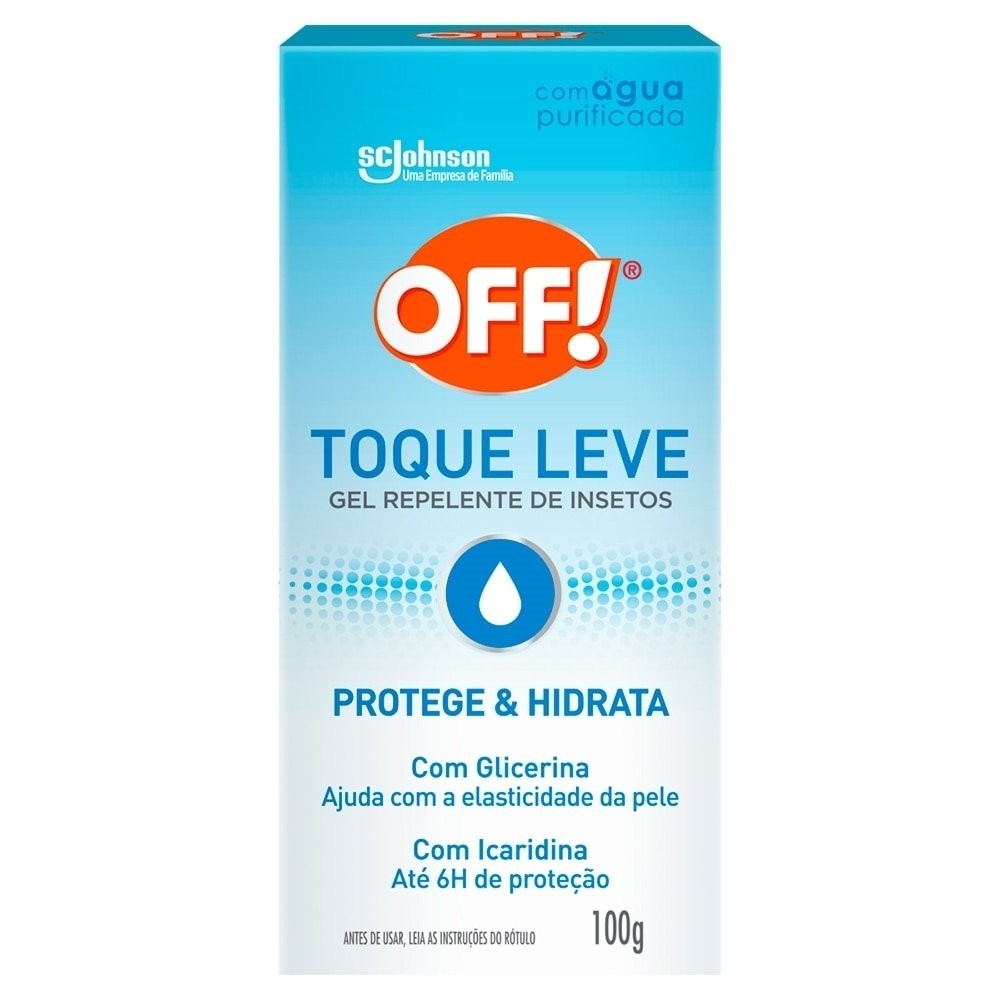 Características Principais do Produto: Área de atuação: Corporal Classificação indicativa: A partir de 1 ano Marca: Off Quantidade: 100g Forma: Gel Linha do produto: Toque Leve Sem perfume: Sim Informações Adicionais do Produto: Textura leve Com água purificada Não oleosa Sem perfume: Porém outros ingredientes podem apresentar perfume Pode ser usado diariamente Repele o mosquito da dengue, do zika vírus e da febre chikungunya Protege e hidrata Ajuda com a elasticidade da pele Até 6h de proteção Modo de Uso: Aplique sobre a pele exposta e espalhe uniformemente com as mãos Para aplicar no rosto coloque uma quantidade do produto nas mãos e leve ao rosto evitando os olhos e a boca A pessoa ficará protegida por até 6 horas, devendo após esse período reaplicar quando necessário Limite de 2 aplicações diárias Composição: Carboxilato de hidroxietil isobutil piperidina, água, álcool etílico, glicerol, ácido poliacrílico, hidróxido de sódio anidro. Fornecedor: Ceras Johnson Ltda