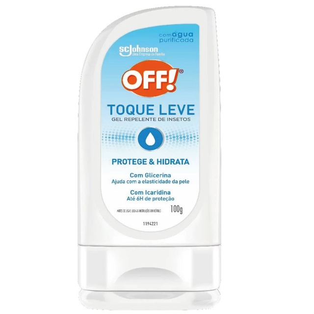 Repelente OFF! Toque Leve Gel 100g: proteção eficaz contra mosquitos por até 6 horas. Fórmula com icaridina 20% e glicerina, hidrata e suaviza a pele sem deixar oleosidade. Ideal para toda a família, a partir de 1 ano.