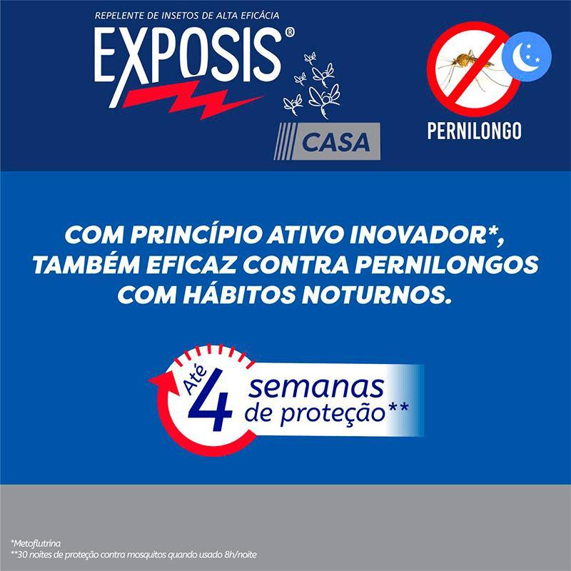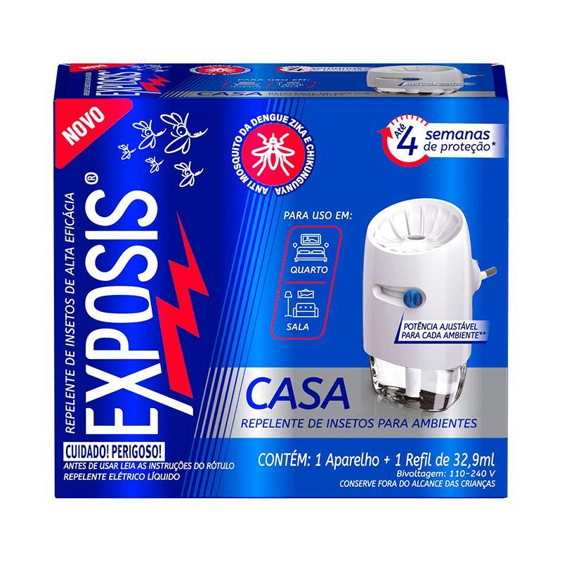 Repelente Elétrico Líquido Exposis Casa Aparelho + Refil 32,9ml - Proteção eficaz contra mosquitos e insetos para toda a família!O Repelente Elétrico Líquido Exposis Casa é a solução ideal para manter sua casa livre de mosquitos e insetos indesejados. Desenvolvido com uma fórmula eficaz e segura, ele protege contra o Aedes aegypti, mosquito transmissor de doenças como dengue, zika e chikungunya. Seu funcionamento é simples: basta conectar o aparelho a uma tomada elétrica para que ele comece a liberar o líquido repelente gradualmente, garantindo uma cobertura eficiente no ambiente. Diferenciais - Alta eficácia: proteção contínua contra mosquitos e pernilongos. - Praticidade: fácil de usar, sem cheiro forte e sem necessidade de reaplicação constante. - Longa duração: cada refil de 32,9ml dura até 45 noites (usando 8 horas por noite). - Seguro para toda a família: desenvolvido para ambientes internos e sem substâncias nocivas ao sistema respiratório. Ideal para quartos, salas e escritórios, o Exposis Casa garante tranquilidade e bem-estar, afastando os mosquitos de maneira eficaz. Benefícios do Repelente Elétrico Exposis Casa - Proteção contínua contra mosquitos e pernilongos. - Fórmula eficiente contra o Aedes aegypti, mosquito transmissor de doenças graves. - Seguro para o ambiente doméstico, sem odores agressivos. - Fácil de usar, basta conectar na tomada. - Duração prolongada, protegendo por até 45 noites com um único refil. - Ideal para uso noturno, garantindo noites tranquilas e sem incômodos. Quanto Tempo Dura o Repelente Exposis Casa?O refil de 32,9ml do Repelente Elétrico Exposis Casa tem duração aproximada de 45 noites, considerando um uso médio de 8 horas por noite. Caso o aparelho fique ligado por períodos mais longos, o consumo do líquido pode ser maior. Perguntas Frequentes1.O Repelente Exposis Casa é seguro para crianças e pets? Sim! O produto foi desenvolvido para ser utilizado em ambientes internos, sem causar riscos à saúde de crianças e animais de estimação. No entanto, recomenda-se posicionar o aparelho em locais de difícil acesso para evitar contato direto. 2. O refil de outras marcas pode ser usado no aparelho Exposis? Para garantir a eficácia do produto, recomenda-se utilizar apenas refis da marca Exposis. O uso de refis de outras marcas pode comprometer a proteção e a segurança do aparelho. 3. Onde devo posicionar o aparelho para melhor eficácia? O ideal é colocá-lo em uma tomada de circulação de ar livre, evitando bloqueios como móveis e cortinas, para que o repelente se espalhe de forma homogênea pelo ambiente. 4. O repelente exala algum cheiro forte? Não. O Exposis Casa possui uma fórmula discreta e sem odor forte, tornando-o ideal para ambientes fechados e para pessoas sensíveis a perfumes intensos. 5. Pode ser utilizado em escritórios e locais de trabalho? Sim! O repelente elétrico Exposis pode ser usado tanto em residências quanto em escritórios, garantindo um ambiente livre de insetos sem interferir no seu dia a dia.