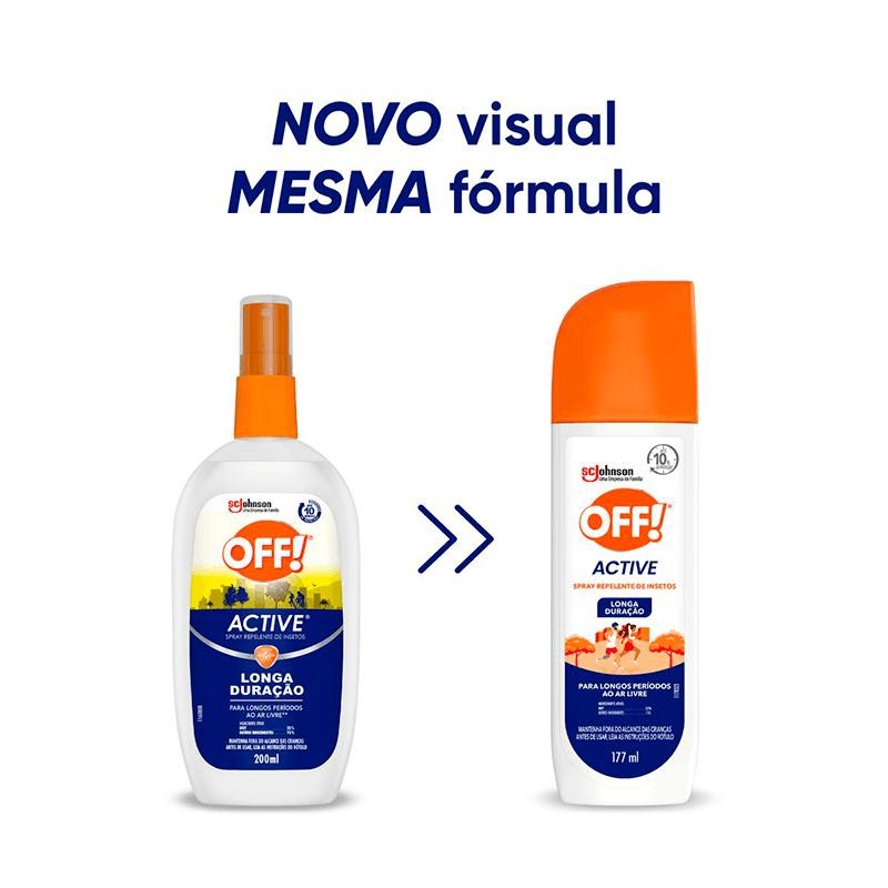 Repelente Off Active Longa Duração Spray - Proteção Duradoura e Segura O Repelente OFF! Active Longa Duração Spray oferece proteção eficaz contra mosquitos, pernilongos e outros insetos, garantindo segurança para você e sua família. Sua fórmula de longa duração é ideal para atividades ao ar livre e uso diário. Por que escolher o Repelente OFF! Active Longa Duração? - Marca confiável e líder de mercado: A OFF! é uma marca reconhecida pela qualidade e eficácia de seus produtos. - Fórmula testada e aprovada: Dermatologicamente testado, garantindo segurança e eficácia. - Proteção prolongada: Garante proteção por horas contra mosquitos e insetos. - Ideal para atividades ao ar livre: Perfeito para viagens, trilhas e momentos ao ar livre. - Textura leve e não oleosa: Conforto durante o uso, sem deixar a pele pegajosa. Benefícios - Barreira protetora eficaz: Impede a aproximação de insetos. - Fórmula leve: Não oleosa e de rápida absorção. - Fragrância suave: Ideal para uso diário. - Longa duração: Protege por mais tempo contra mosquitos. Como Usar Agite bem antes de usar. Aplique uniformemente sobre a pele exposta. Evite contato com olhos, boca e mucosas. Não aplique sobre pele irritada ou ferida. Reaplique conforme necessidade. Proteção Contra Mosquitos Transmissores de Doenças - Aedes aegypti: Dengue, Zika e Chikungunya. - Aedes albopictus: Dengue, Zika e Chikungunya. - Anófeles: Malária. - Culex: Filariose. Principais Ativos - Icaridina: Proteção de longa duração (8 a 10 horas). - DEET: Proteção eficaz por até 4 horas. Perguntas Frequentes 1. Qual a idade mínima para uso? Consulte a embalagem para informações sobre faixa etária. 2. Pode ser usado por grávidas? Consulte um médico antes de usar. 3. Como aplicar corretamente? Aplique sobre a pele exposta, evitando áreas sensíveis. 4. Quanto tempo dura a proteção? Pode variar conforme a transpiração e condições climáticas. 5. Protege contra todos os insetos? Eficaz contra mosquitos e pernilongos. Para outros insetos, verifique produtos específicos